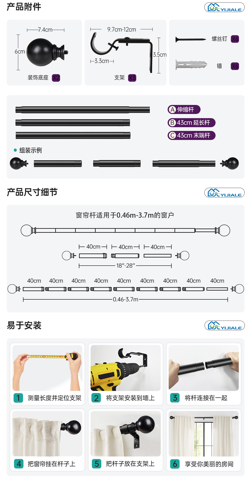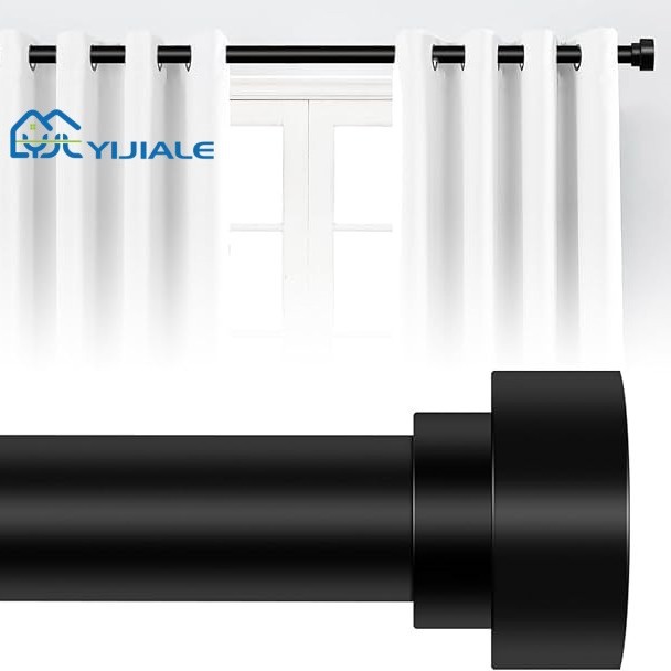 跨境工业风窗帘杆 18- 240英寸窗帘罗马杆拆装简单黑色金属窗帘杆