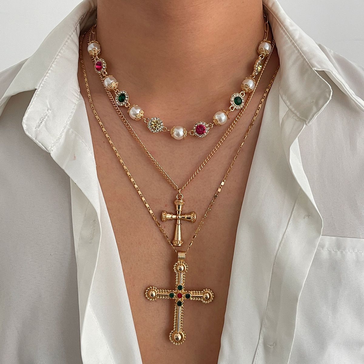 ヨーロッパとアメリカのファッショナブルなパーソナライズされたダイヤモンドクロスネックレスメンズハイエンドヒップホップニッチダイヤモンドパール鎖骨チェーンジュエリー