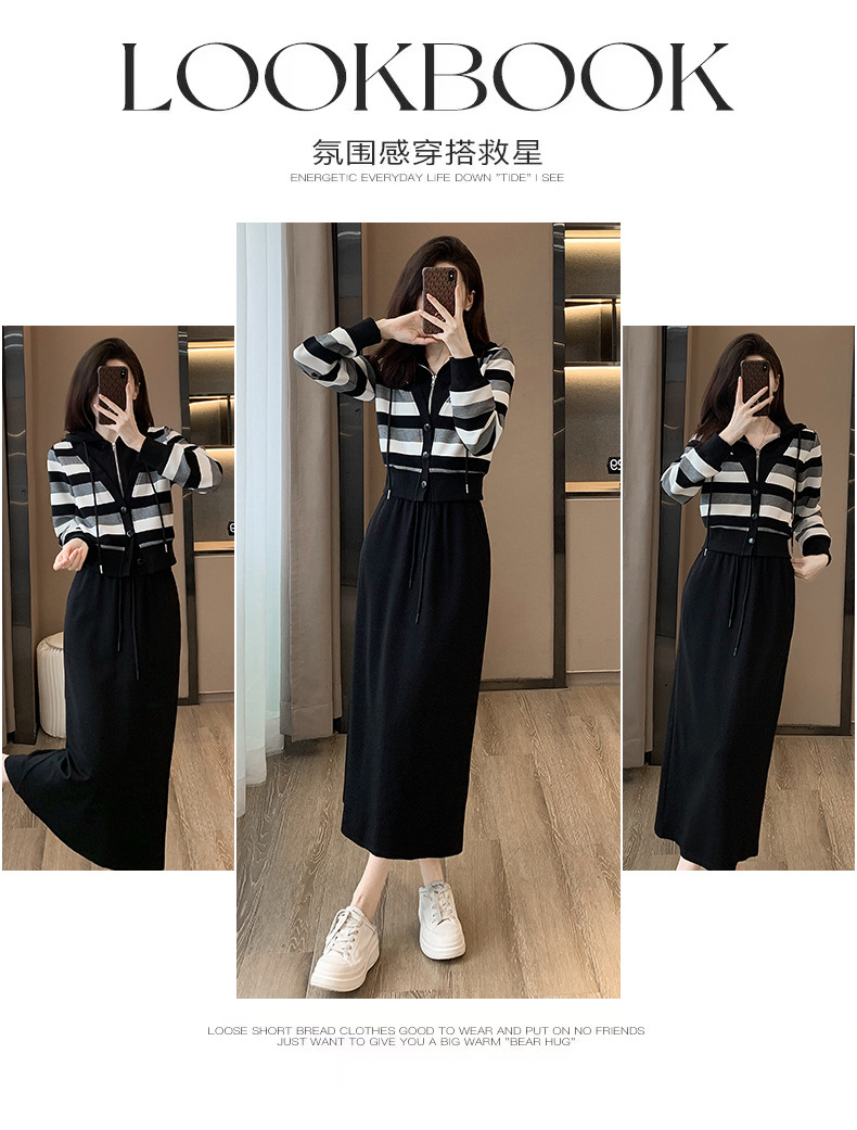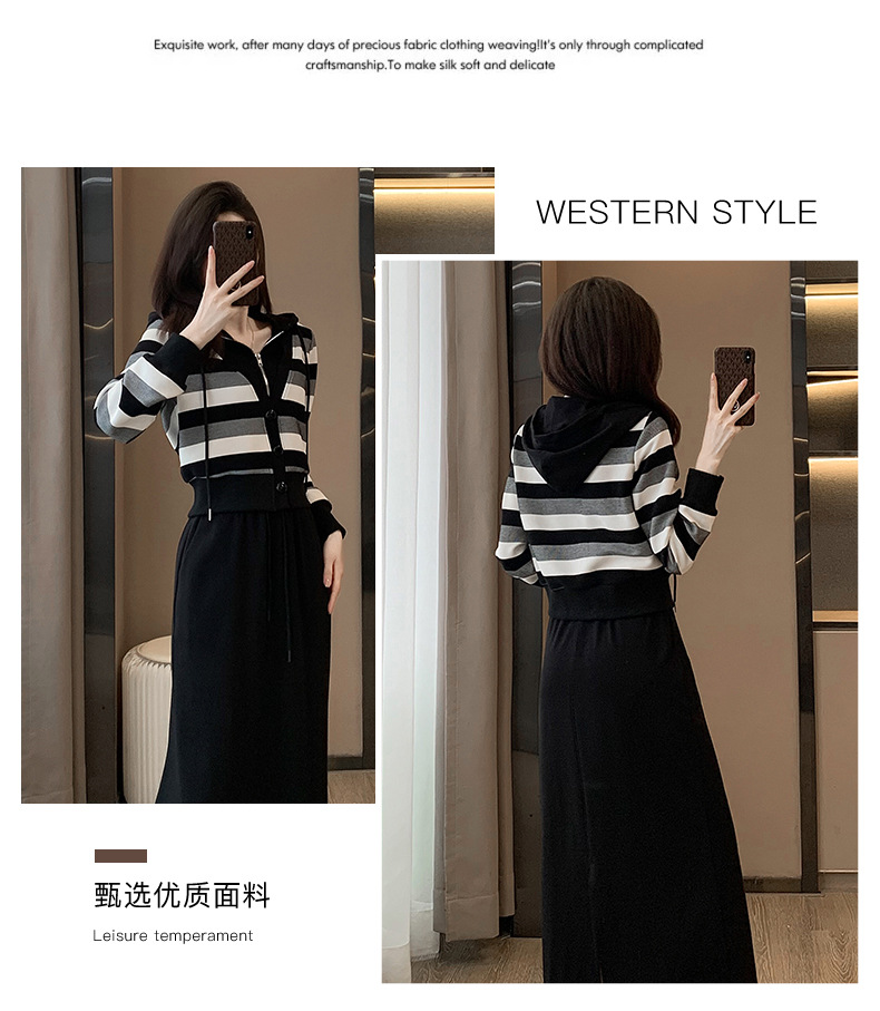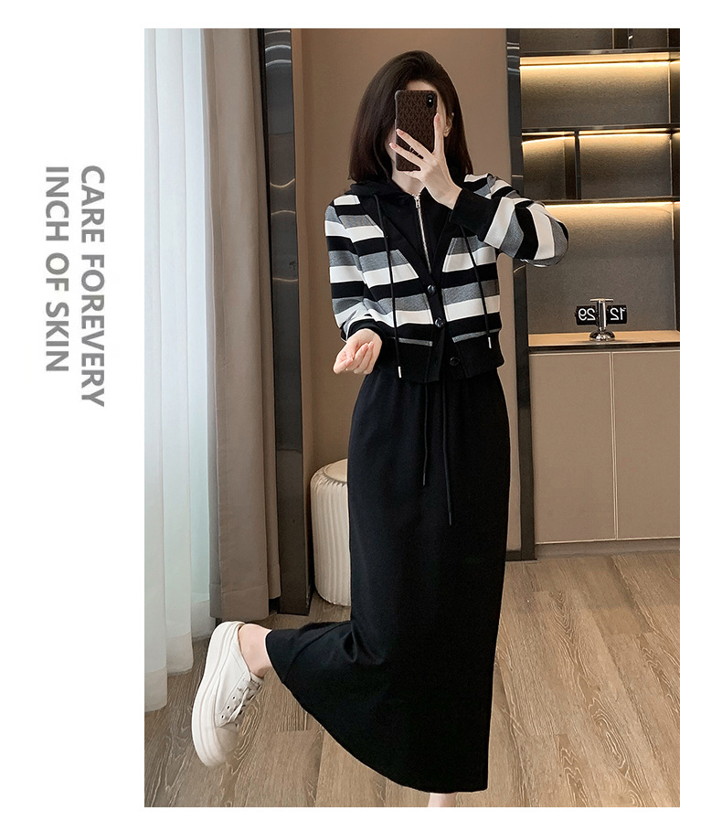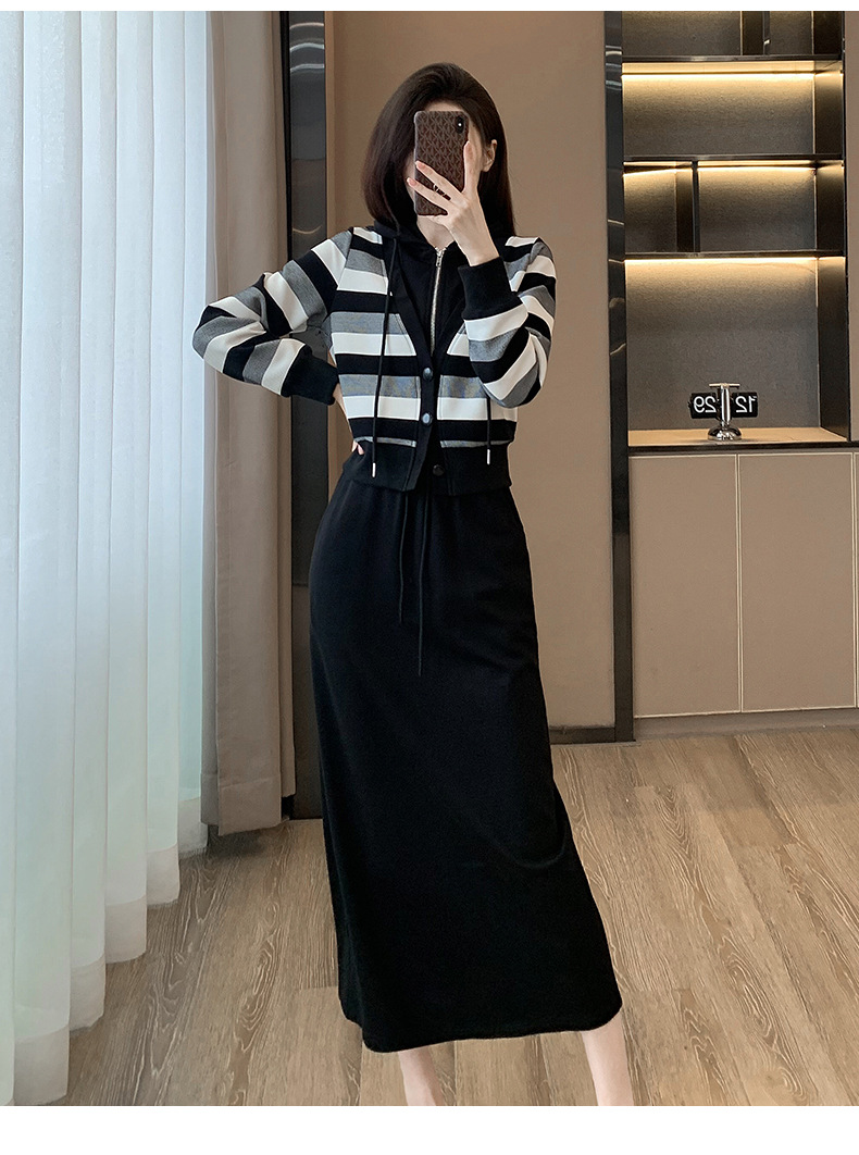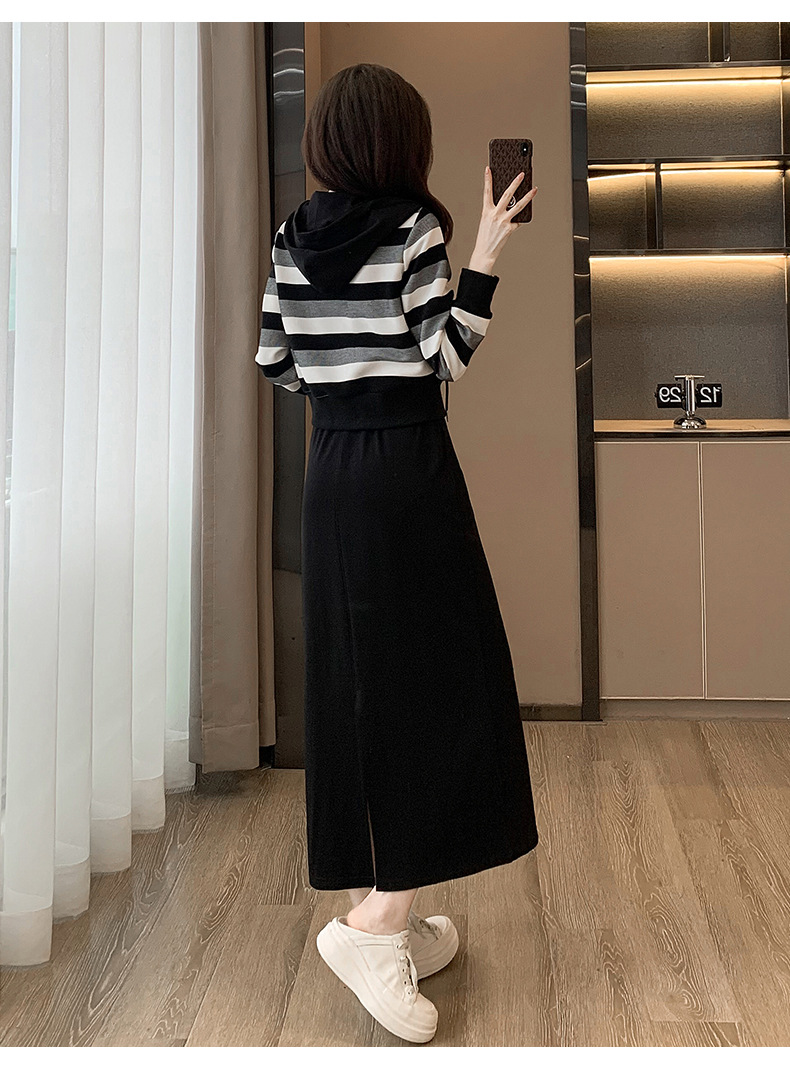 ヨーロッパの春と秋の婦人服、2025年流行の美しいカジュアルなフード付きフェイクツーピースワンピース