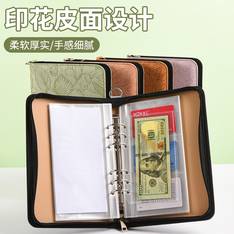 A5活页记账本PU存钱夹印花拉链手提包现金预算卡包存单本收纳袋