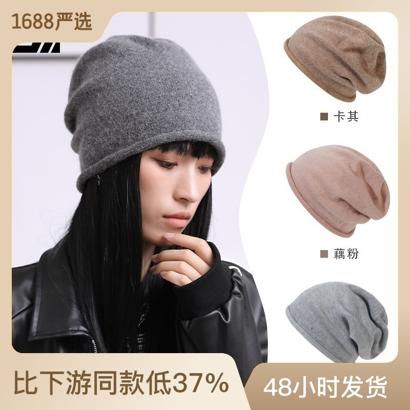女性用の大きな頭囲の秋冬用暖かい帽子、男性用の高級カシミア防寒帽子、グレーのパイル帽子、シンプルな耳保護ニット帽