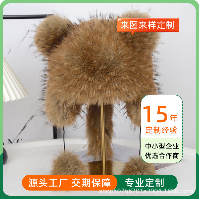 小さなアライグマの尻尾を模したフォックスファーの耳当て付きレインボーハット 女性用冬用厚手防寒毛皮風雪帽子