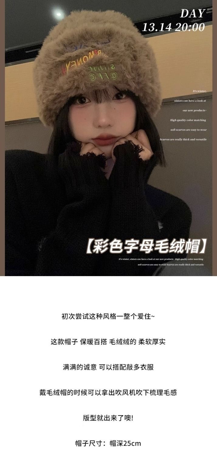 秋冬季彩虹糖豆加绒毛线帽女款毛绒帽加厚包头护耳帽保暖针织帽子