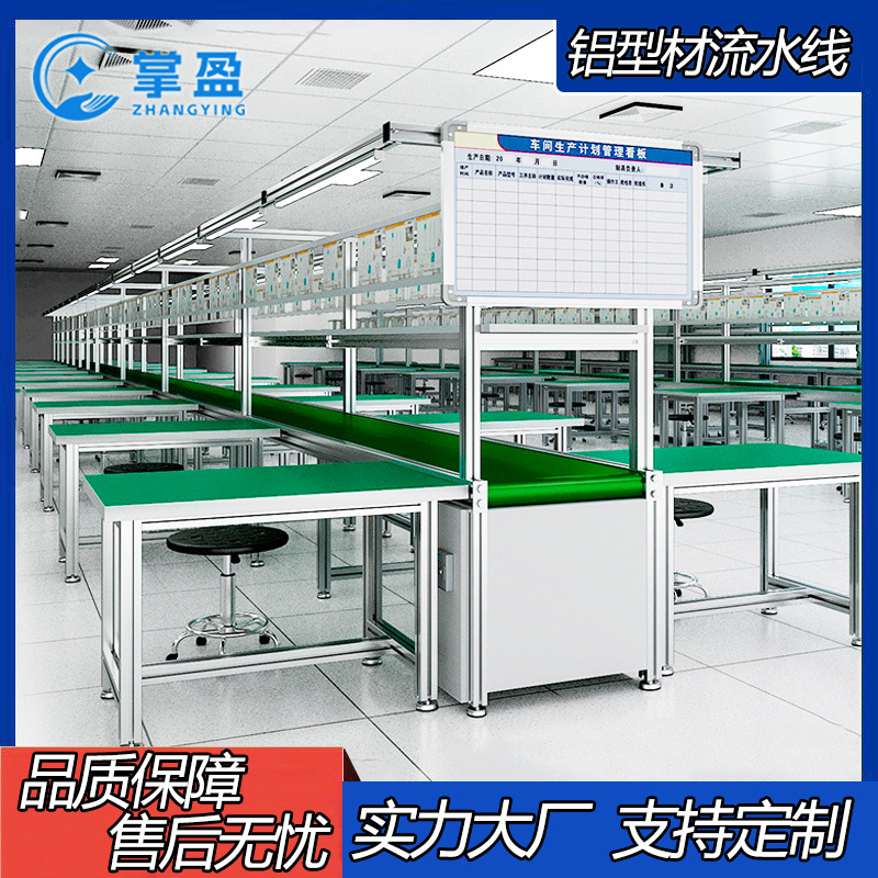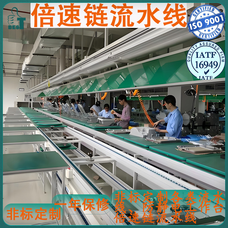 生产线整体支架采用40*40*1.2标准工业铝材加标准连接件组装而成,传动皮带采用绿色亮光硬皮带,动力系统采用220V优质电机和齿轮调速系统带动, 台面板采用16mm三胺板贴2mm哑光防静电台垫,四周包灰白色封边条,工作台照明系统采用T-5单支带罩百分百节能灯,灯罩自带开关,电源排插采用香港公牛国际标准排插,脚杯采用黑色工业水平防静电调节脚杯,作业指导书看板采用压克力看板,可配置置物台,物料台,抽屉,静电扣等附件。产品广泛应用于电子制造业 ,汽车工业,制药业,各种化工,精密五金,净化车间等多样化生产环节。可根据实际需求设计各种不同造型,产品骨架管材可采用精益管,防静电精益管,彩钢管等多种管材组合,也可采用其它多种金属材料组装而成灵活方便,客户可根据实际生产需求进行简单有效的调节,能提高企业的生产效率和形象,为企业节约生产成本。