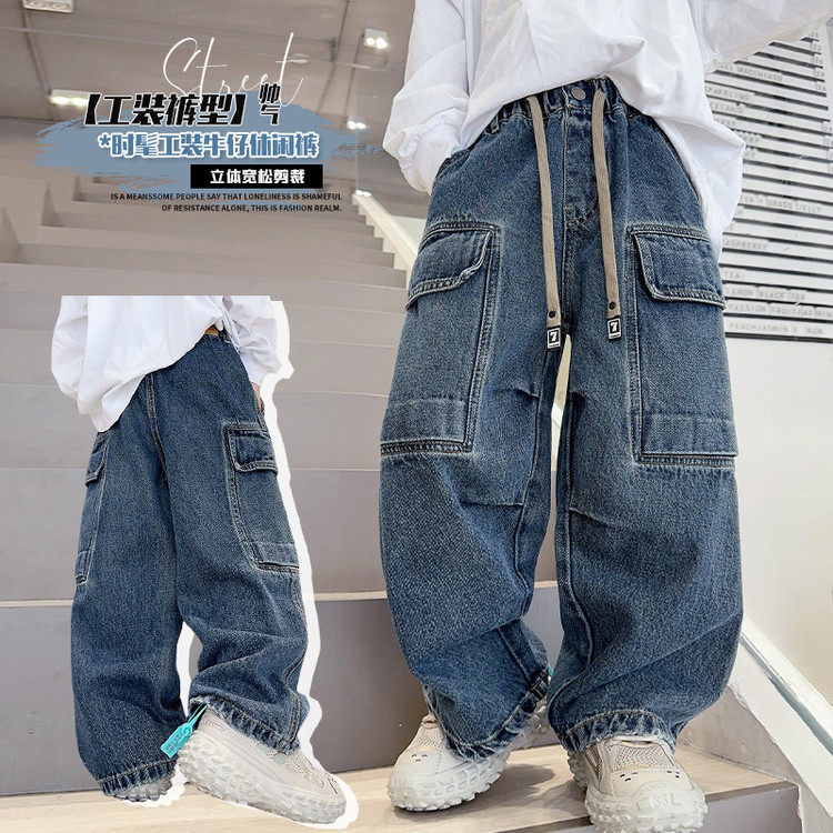 儿童裤子春秋款宽松工装牛仔裤新款中大男童洋气韩版阔腿长裤潮