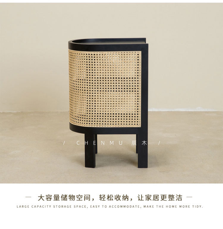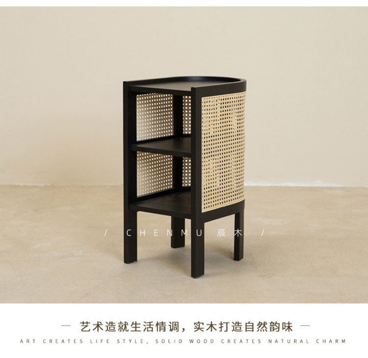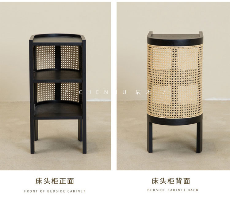 新品レトロ籐編みベッドサイドテーブル中古風寝室シンプルモダン45cm黒くるみ木製色ベッドサイド収納キャビネット