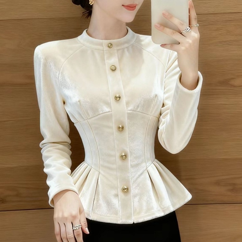 高端长袖立领上衣女秋冬超好看独特漂亮减龄气质掐腰白色丝绒衬衫
