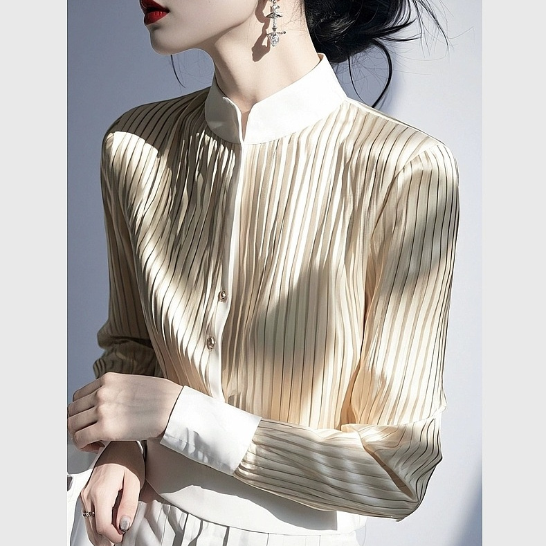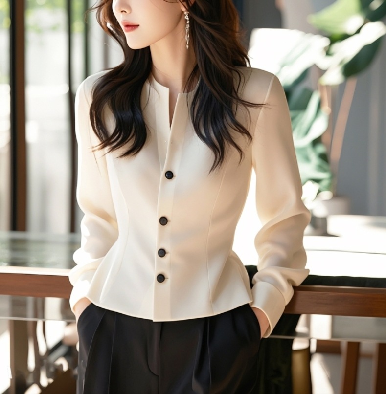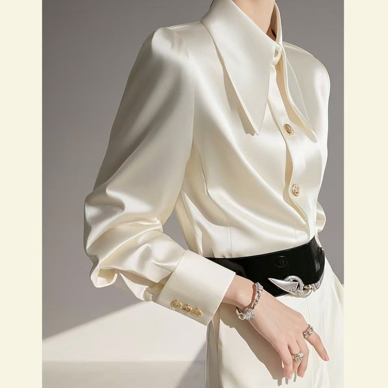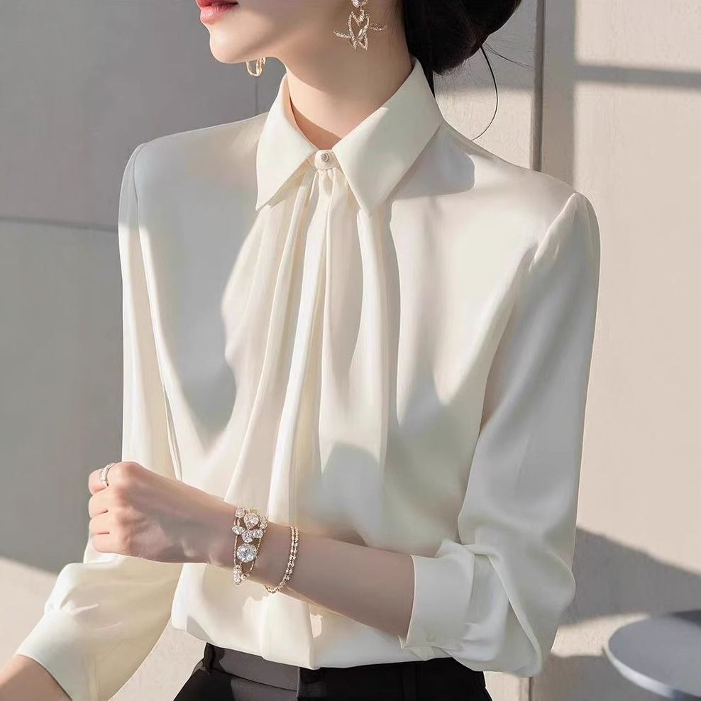今年爆発した白い立襟サテン長袖シャツ2025早春女装高級インナー重ね着職業シャツ