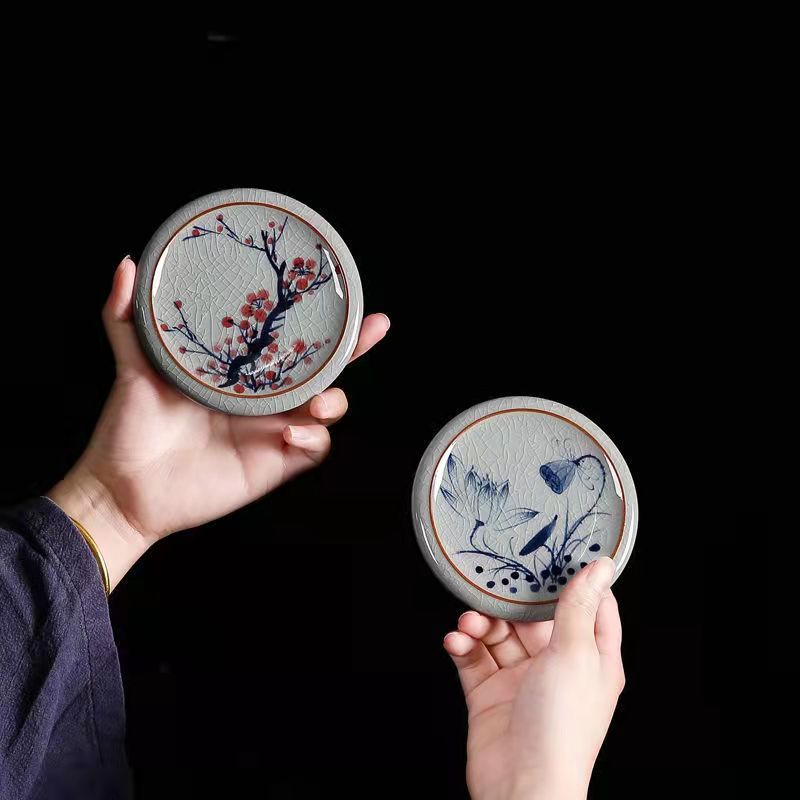 中国式模造青花蓋置手技茶道杯托陶磁器開片レトロ杯托茶壺蓋置茶杯