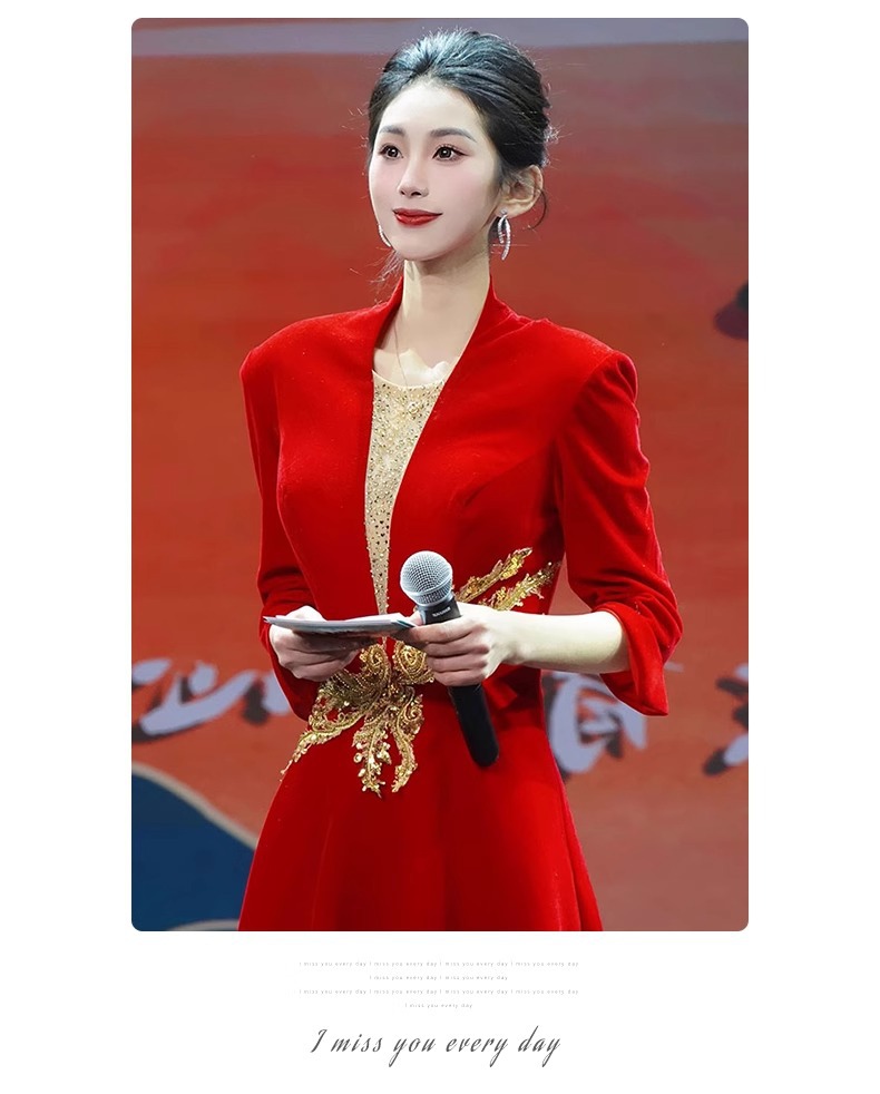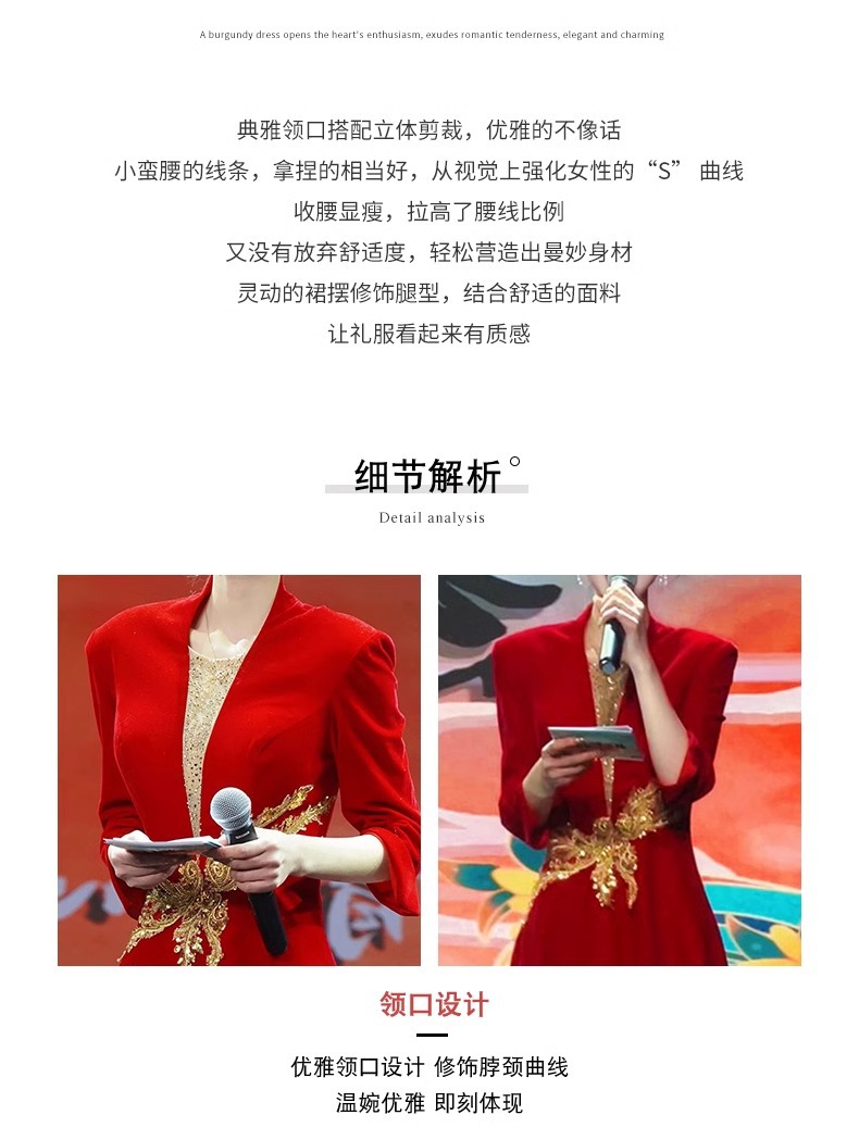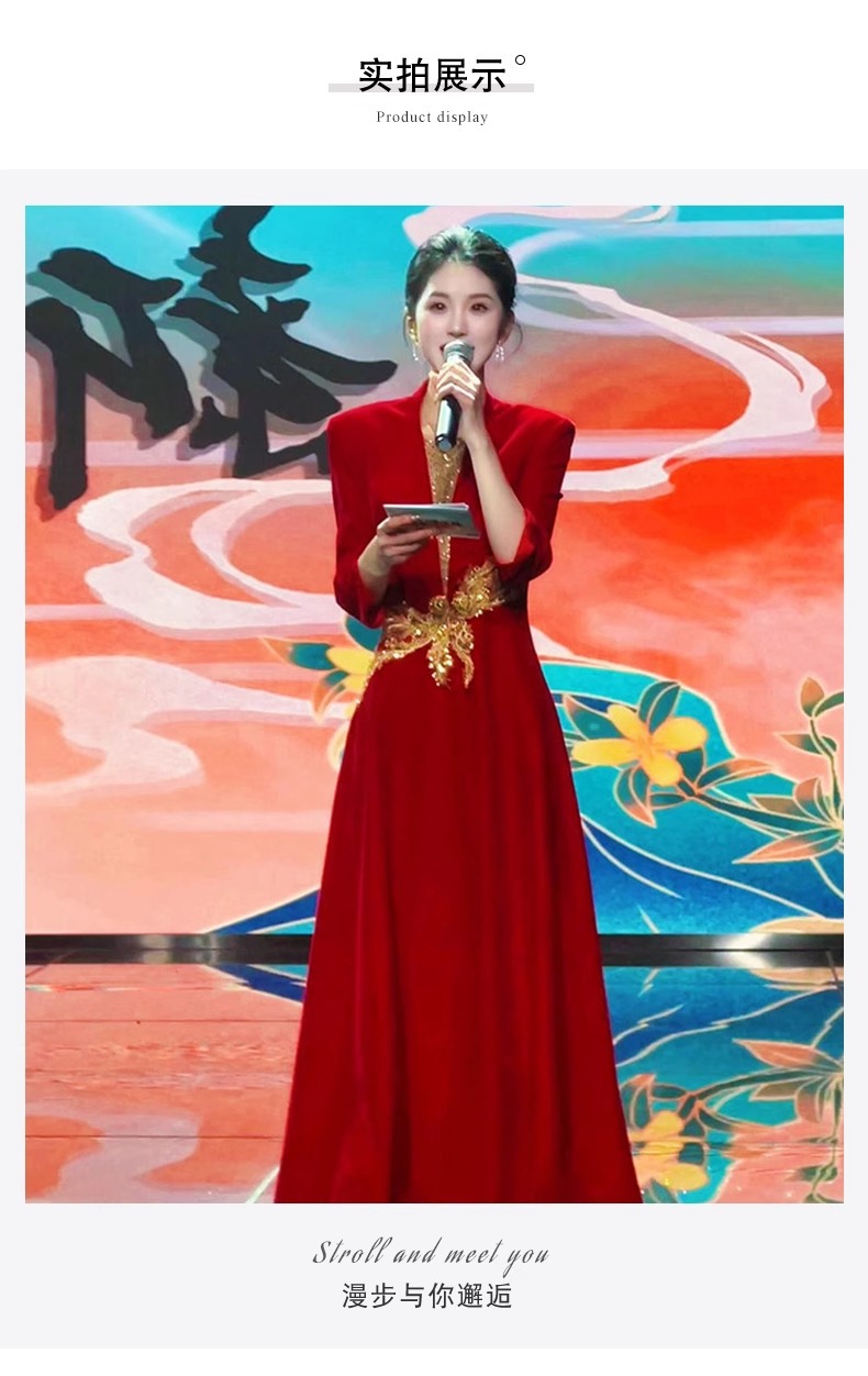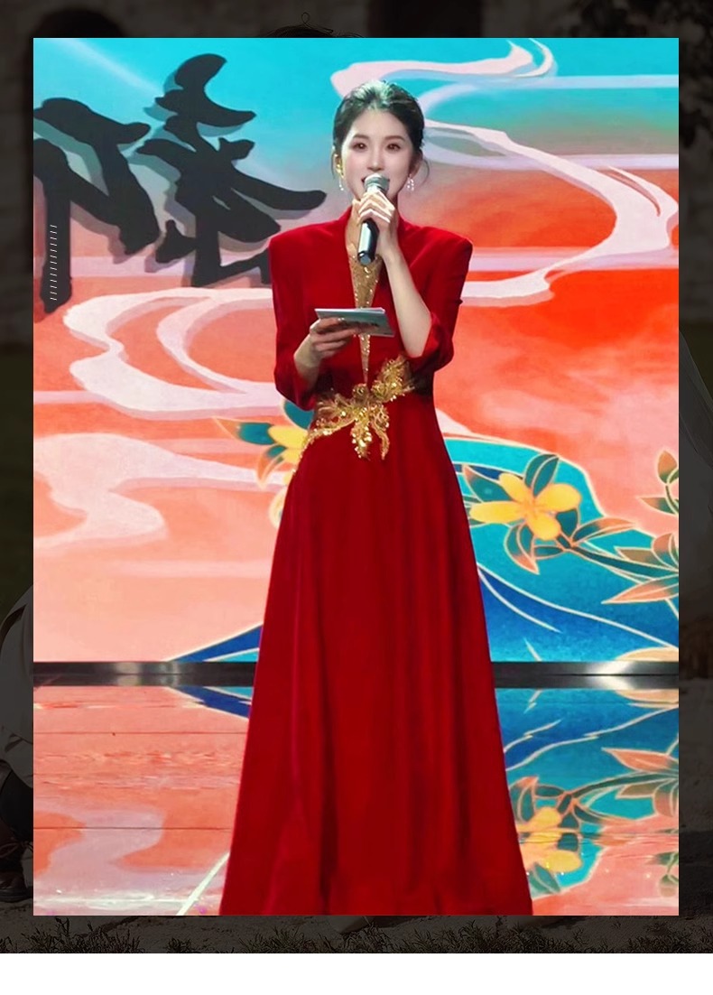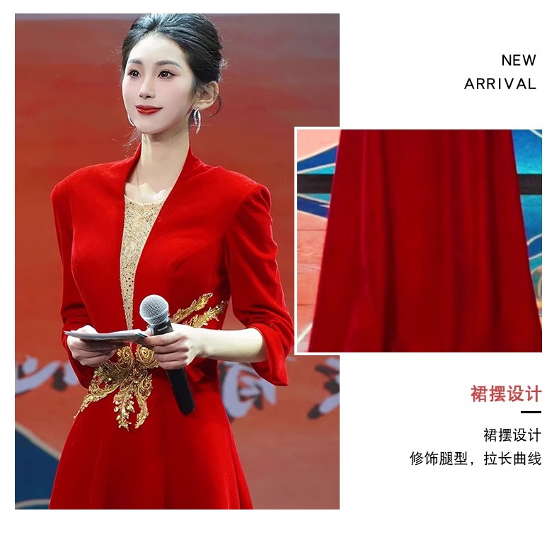 司会者用イブニングドレス2025新作 レッド 中国風 高級感 気品ある演出服 女性用 ロング丈 立体刺繍