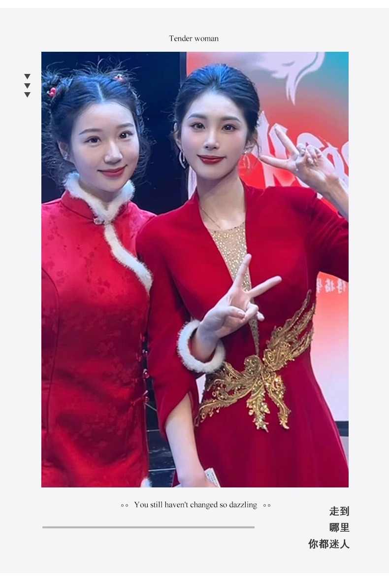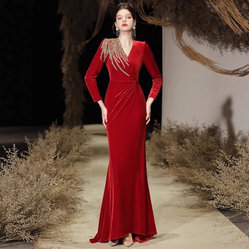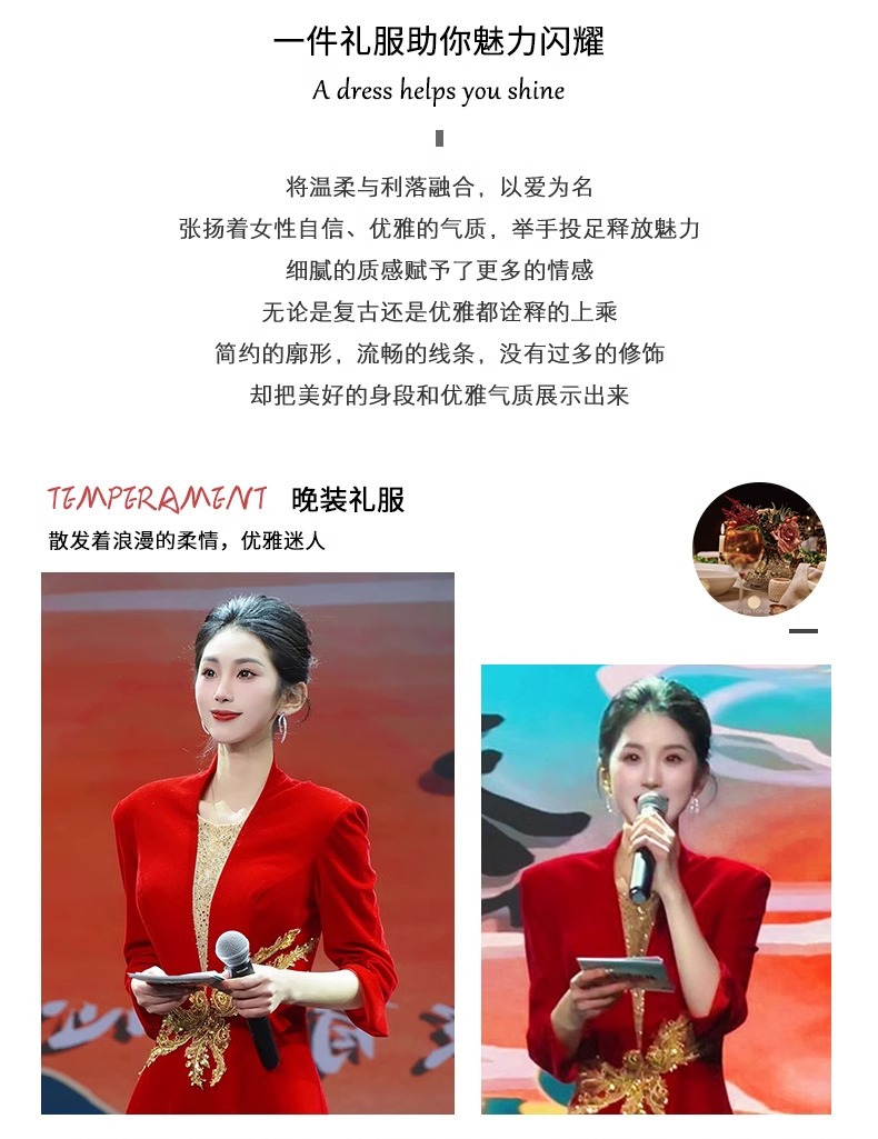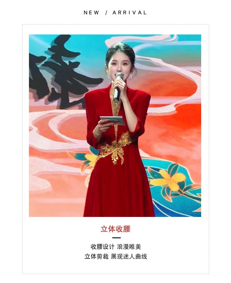 司会者用イブニングドレス2025新作 レッド 中国風 高級感 気品ある演出服 女性用 ロング丈 立体刺繍