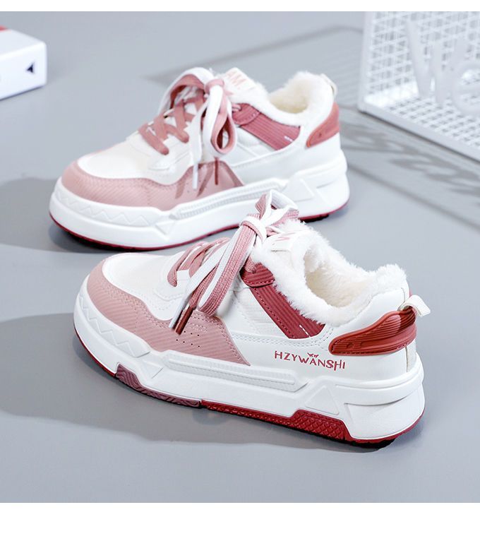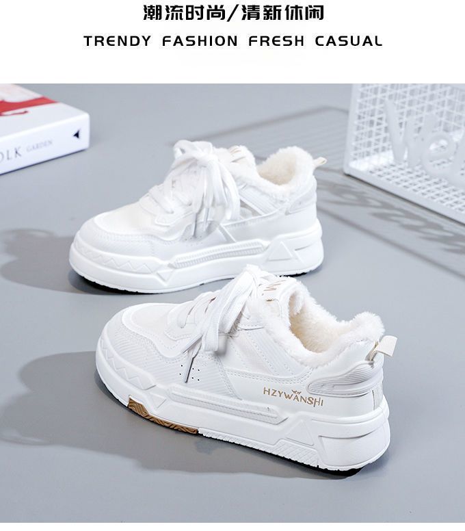 2025秋冬新作、裏起毛で暖かいレディース白スニーカー、個性的なスニーカー、学生向け、フラット、カジュアル、ローカット、コットンシューズ