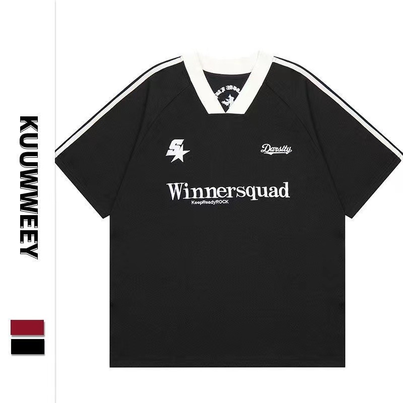 アメリカの高街のレトロな刺繍は色のvネックの半袖のtシャツの男女のゆったりしているレジャーのカップルのスポーツのユニフォームの半袖の潮を合わせます。