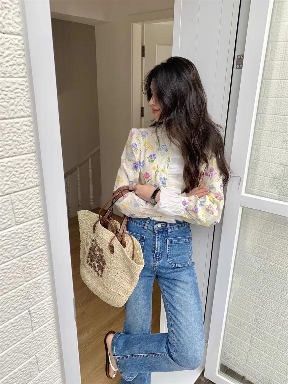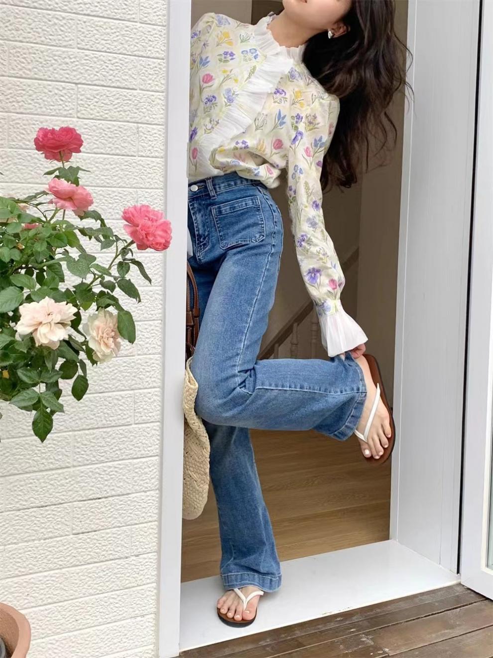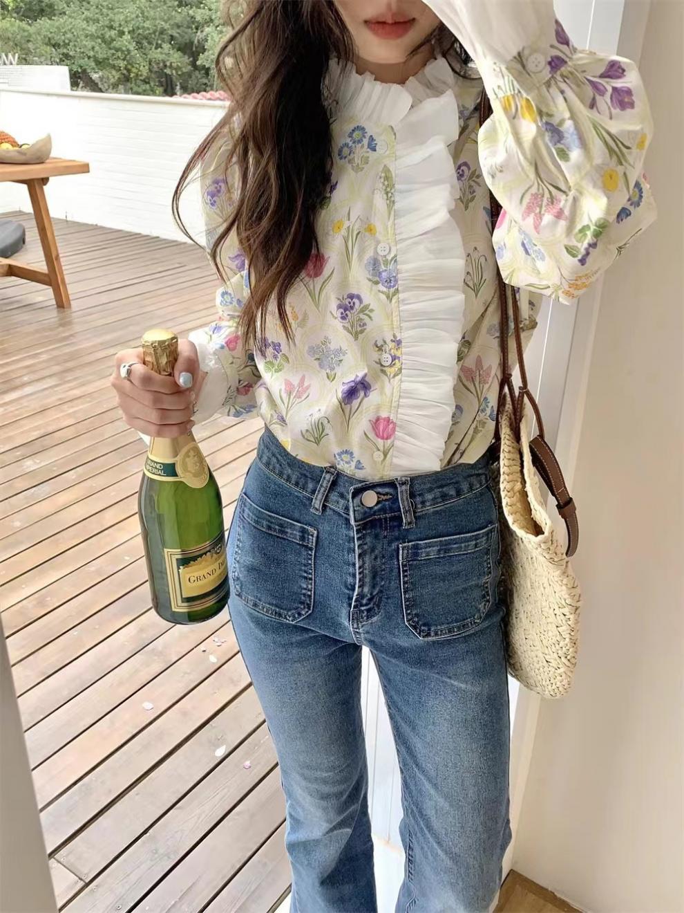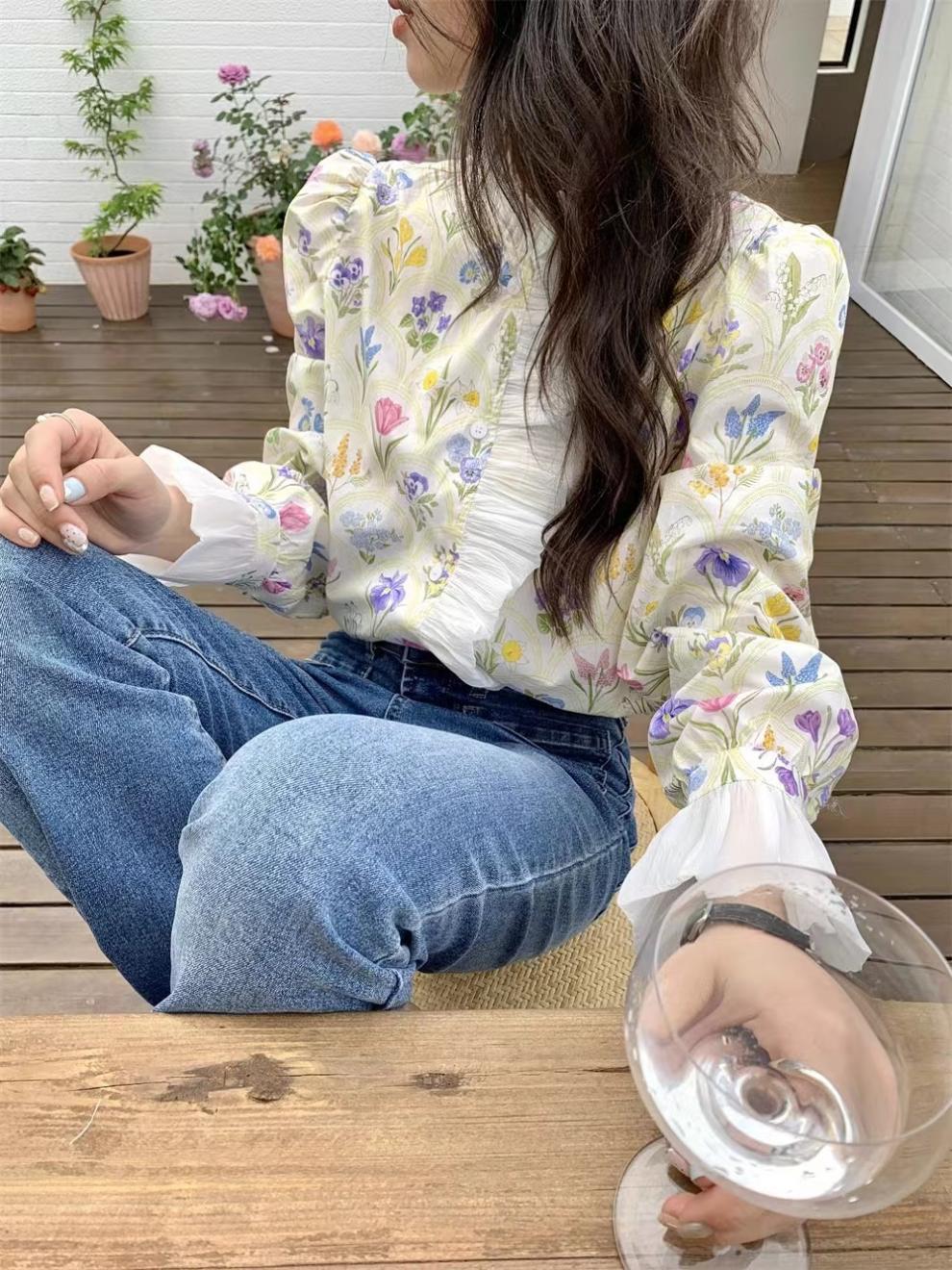 韓国のchi夏のフランス式ロマンチックな高襟はハスの葉の縁の花柄のプリントのデザインのラッパの袖のシャツの上着をつなぎ合わせます。