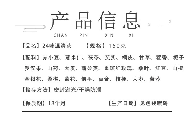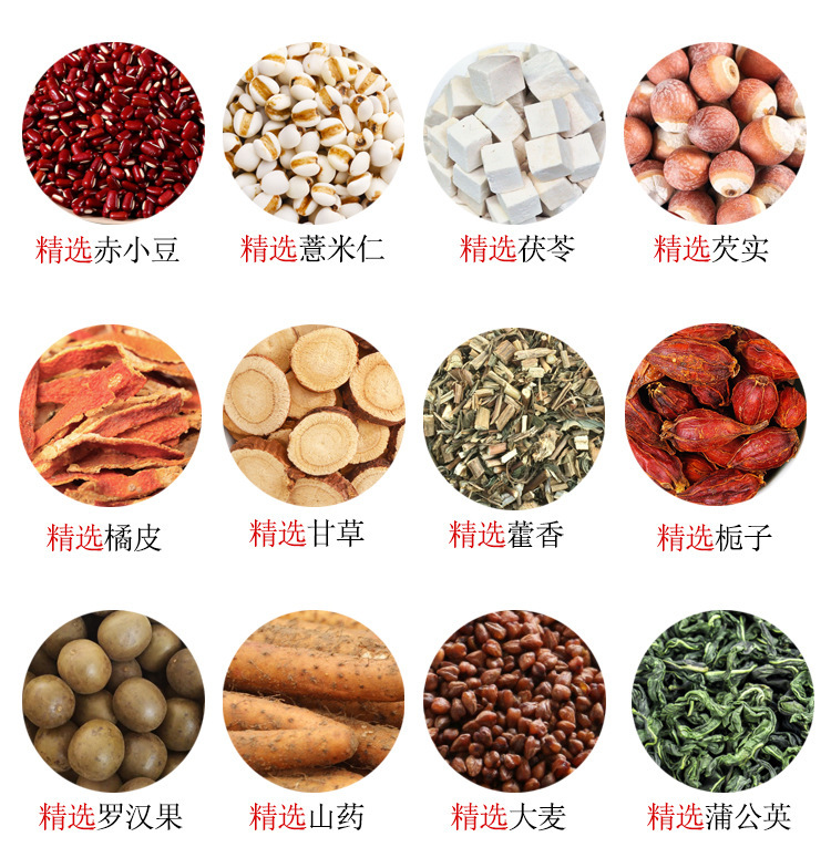 原材料と原材料 ナツメ、オレンジピール、大麦、小豆、恵義仁、ポリア、ゴルゴン、甘草、桑の実、クチナシ、羅漢果、山芋、タンポポ、八重紅