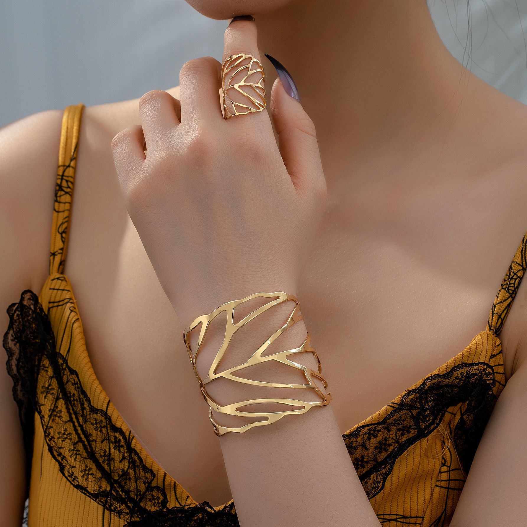 国境を越えて人気の個性的な誇張されたジュエリー、ヒョウ柄の幾何学模様の不規則なブレスレットとリングの2点セット、パーティーに最適
