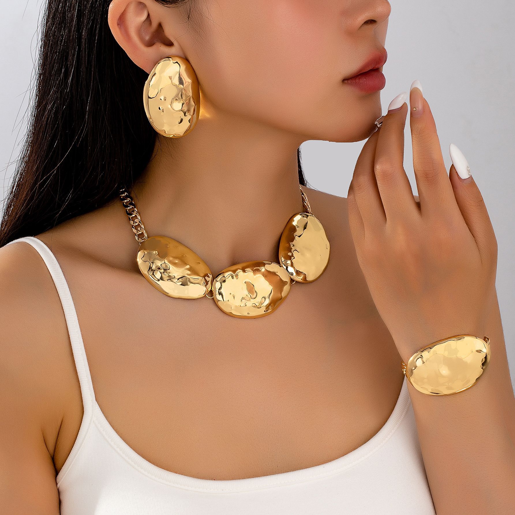 パーソナライズされたトレンディな誇張された幾何学模様の楕円形のイヤリング、ネックレス、ブレスレットのセットは、女性のストリートパーティーの着用に適しています。