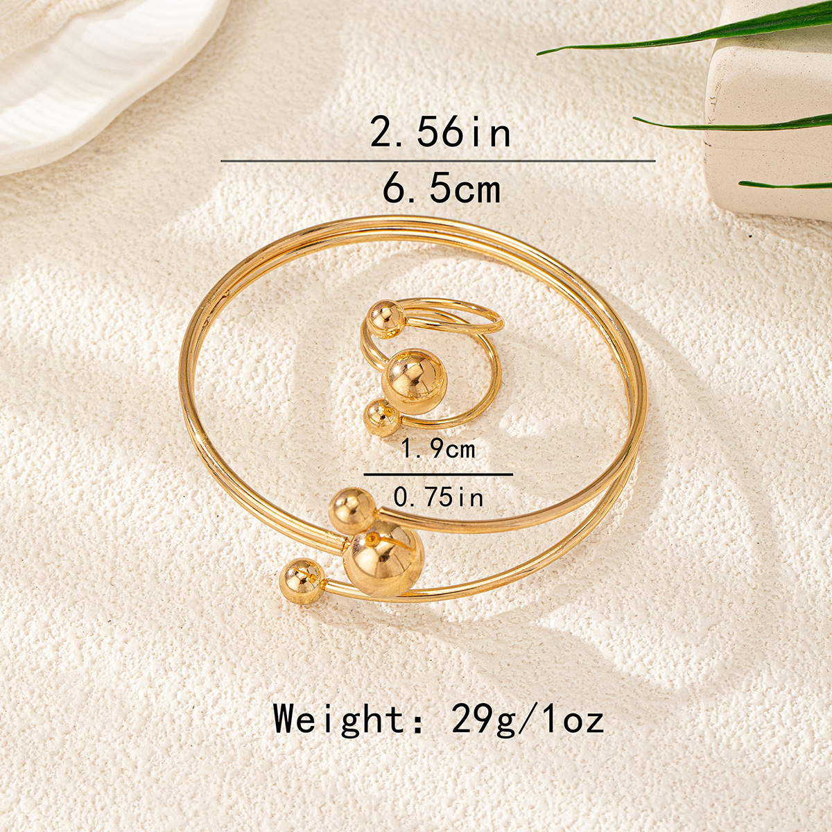 欧美跨境潮流新款几何线条小球女士开口手镯戒指套装适合日常佩戴