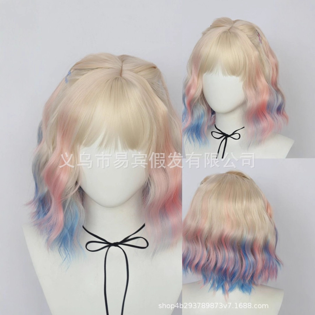 Yibin 民初レトロピンクサイド分けショートカーリーヘアヨーロッパとアメリカンスタイルの女性のショートカーリーヘア高温シルクウィッグ