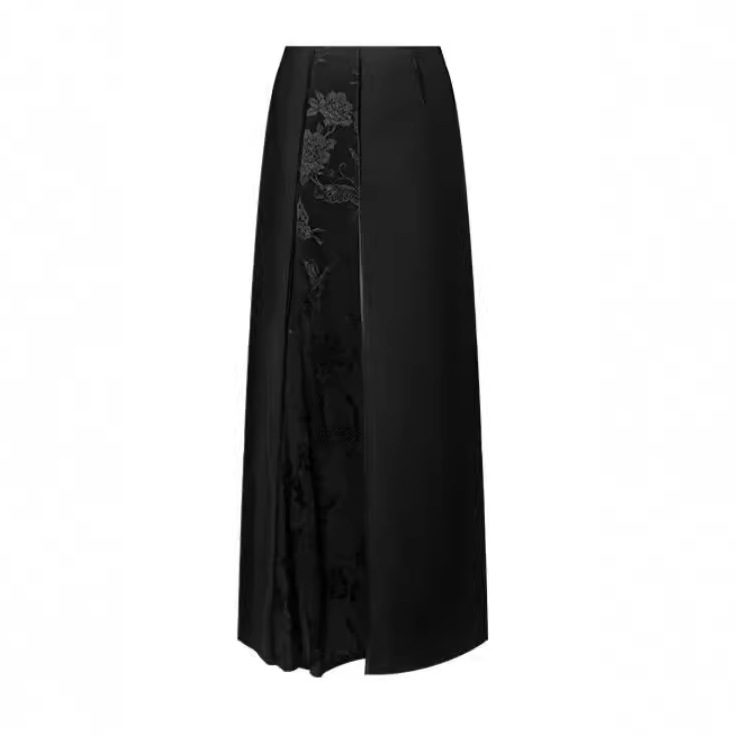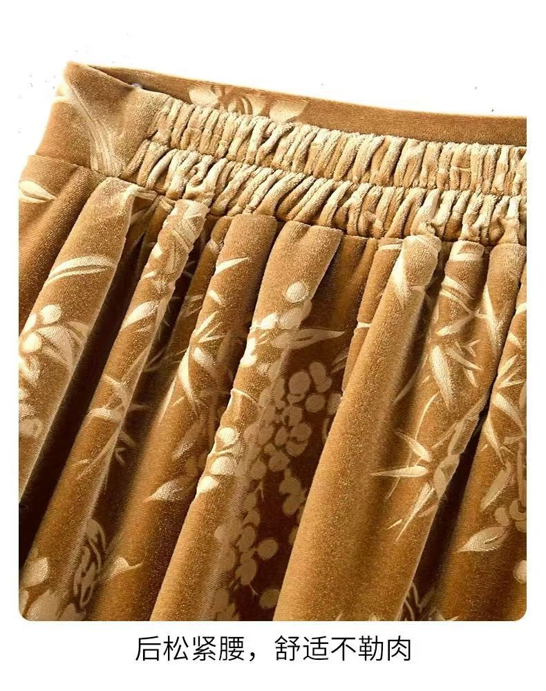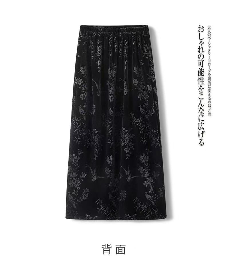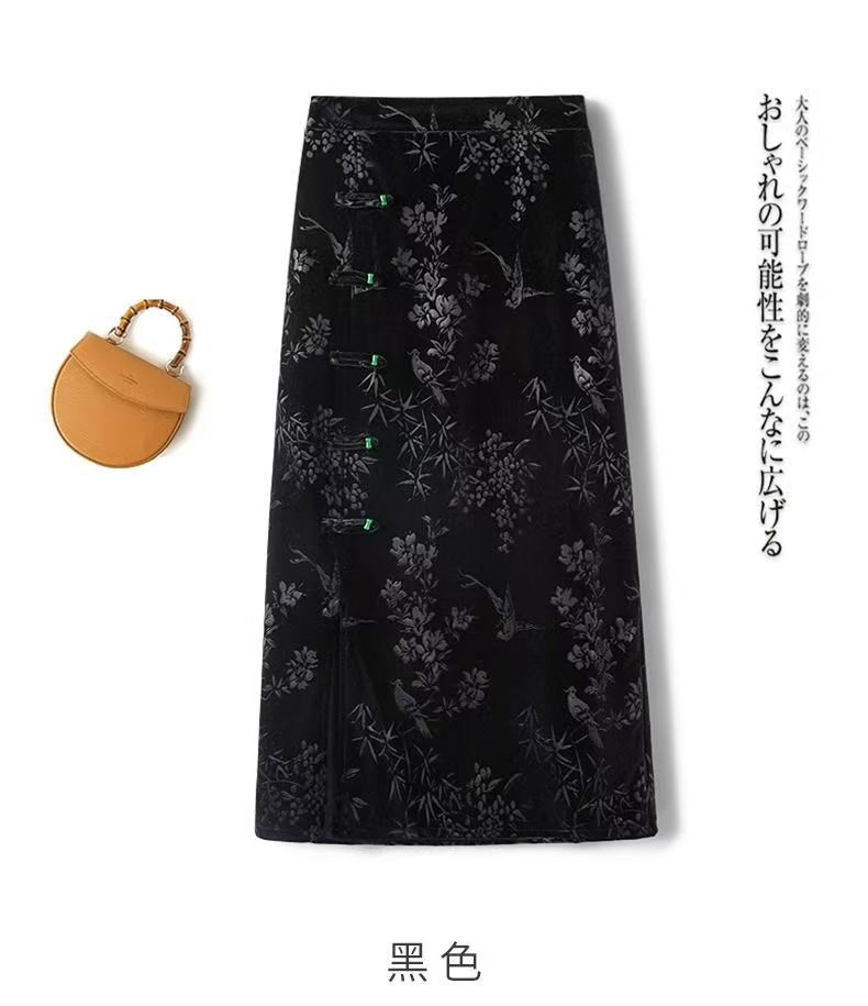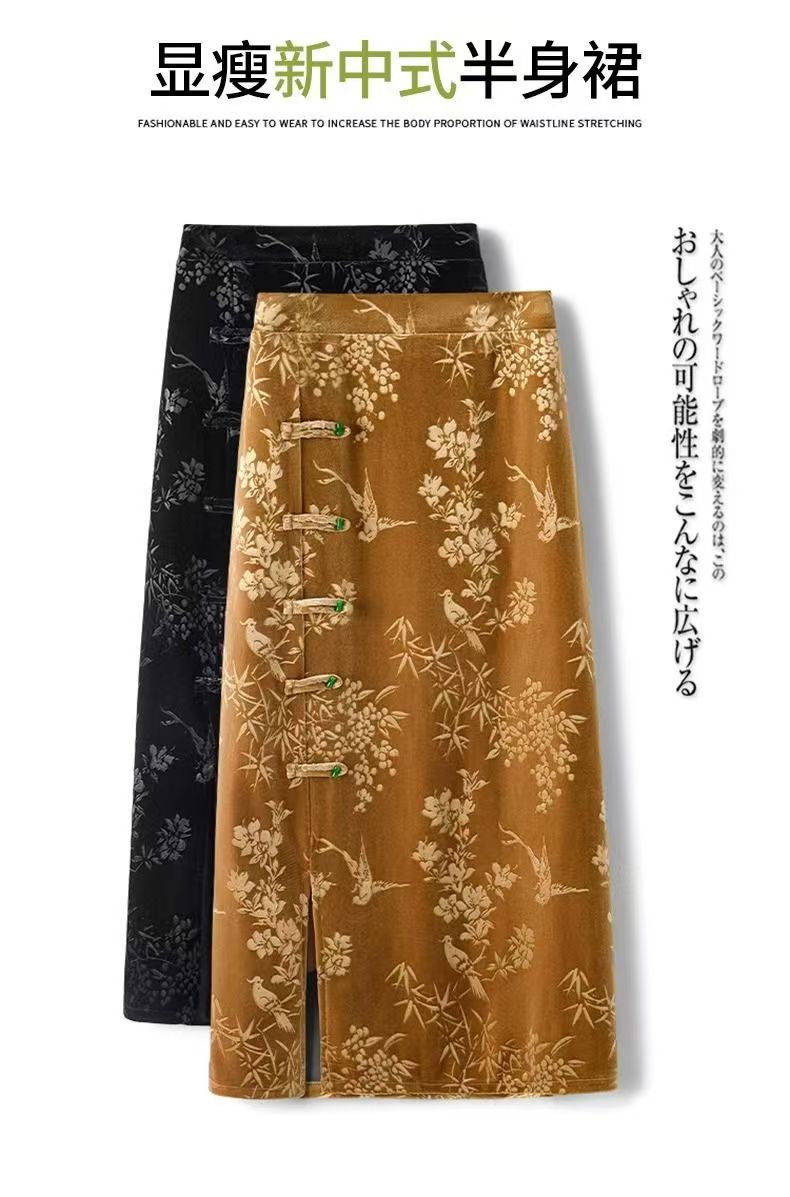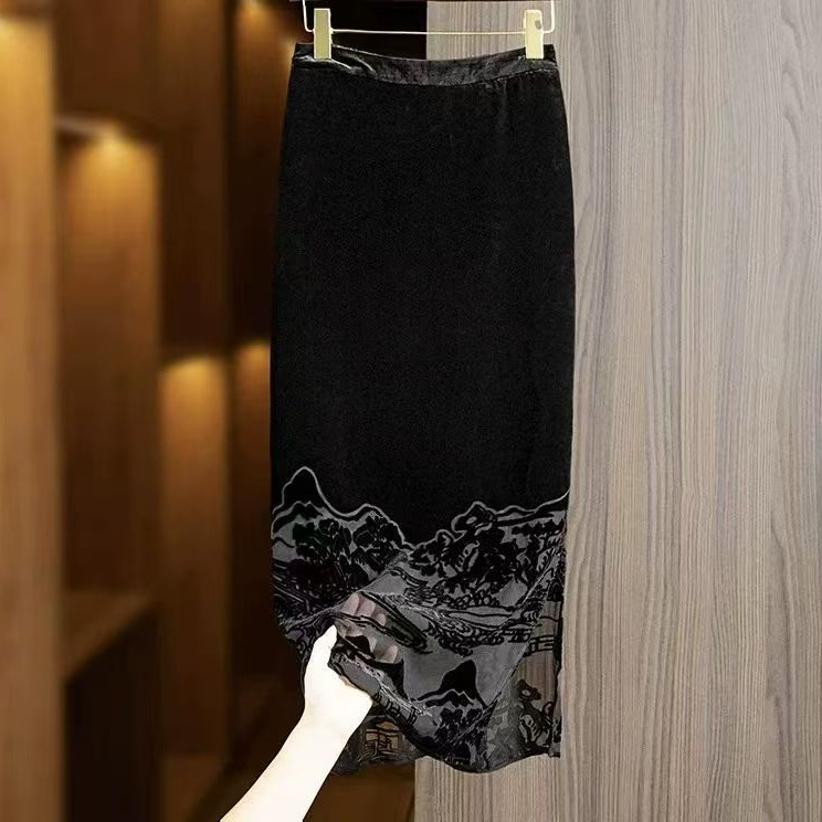 2025秋季爆款丝绒烧花半身裙女黑色显瘦气质百搭裙子中式国风长裙