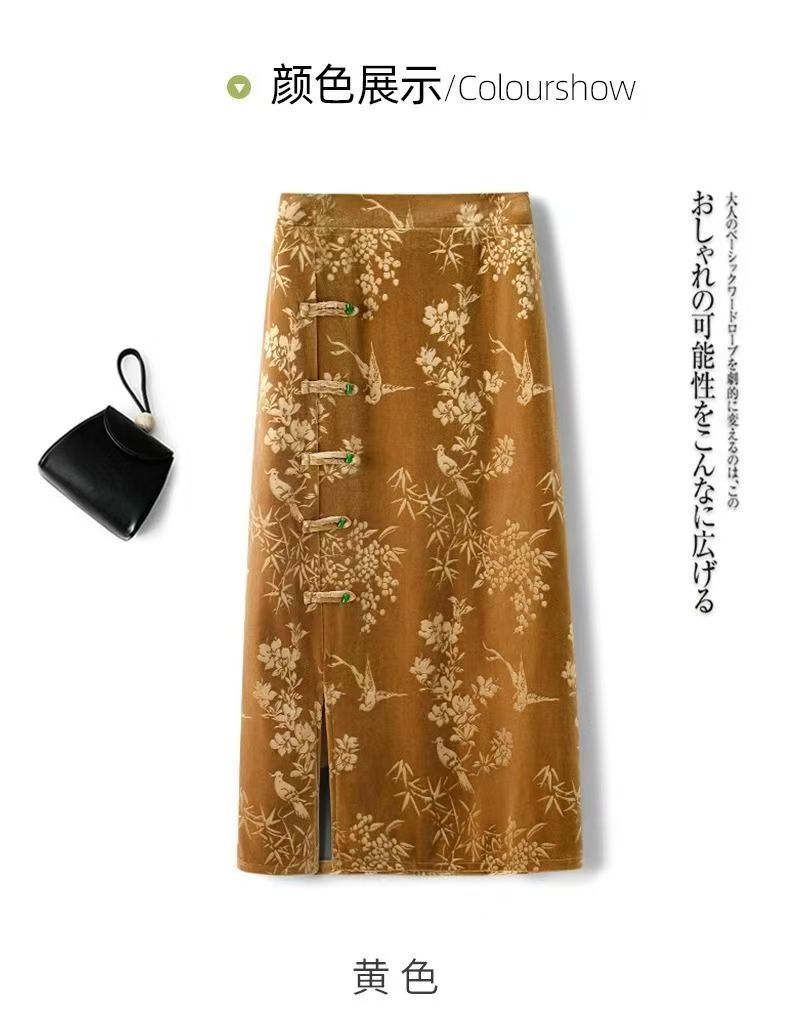 新中式民族風婦人服秋冬2025新作ハイウエストAラインスカートレトロ花柄ボタン付きヒップスカート