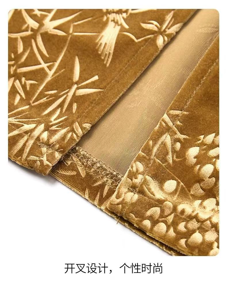 新しい中国式のスカートの国風の復古の盤はジャカードの半身のスカートの女性の秋の金のベルベットのオープンフォークのお尻の膝の長いスカートを掛けます。