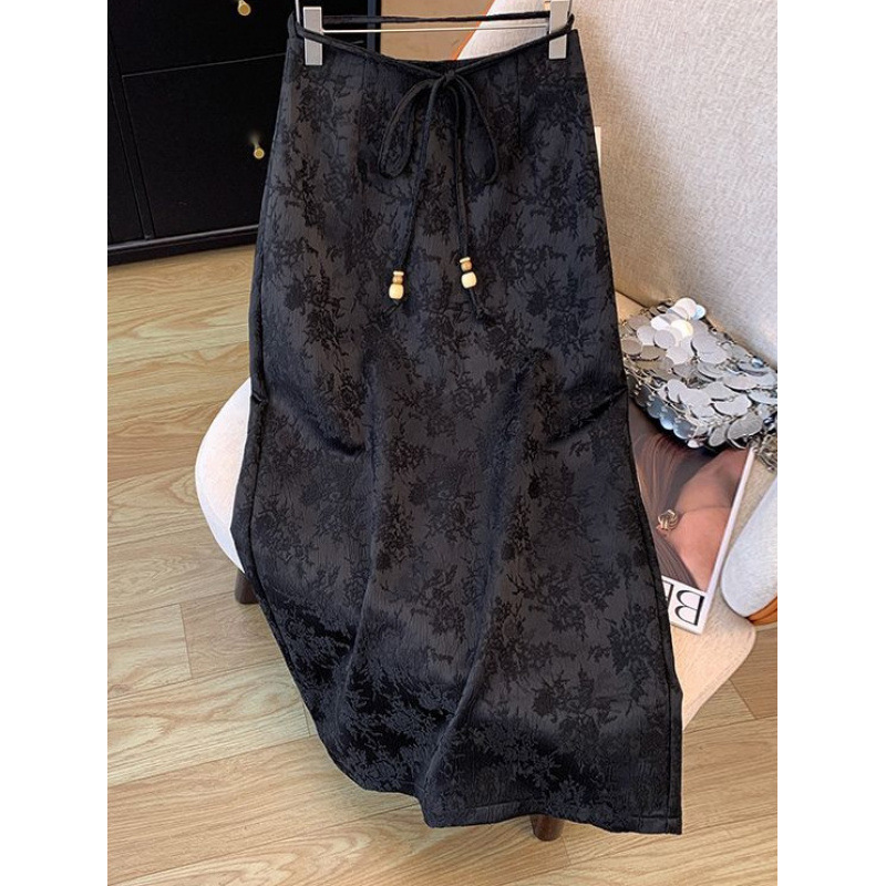 国風レトロジャカード酢酸サテンスカート女性新中国式オープンフォークヒップスカート