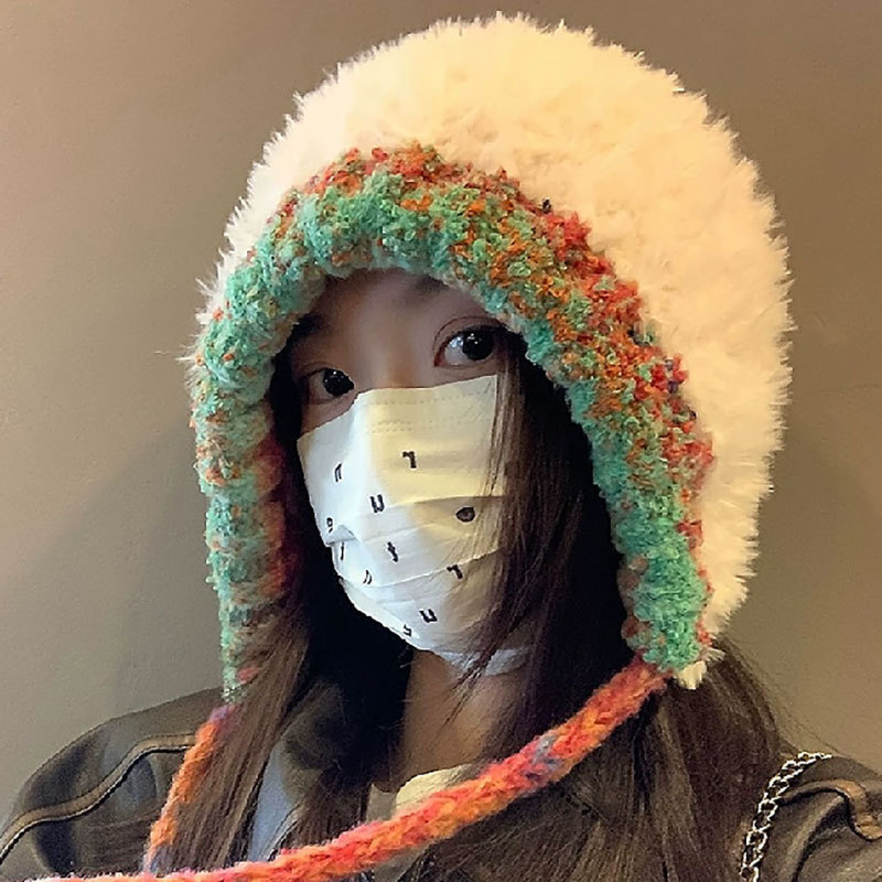 毛のふわふわしたニット帽の女性は秋冬に日本の大きい頭の周りを厚くして保温します。