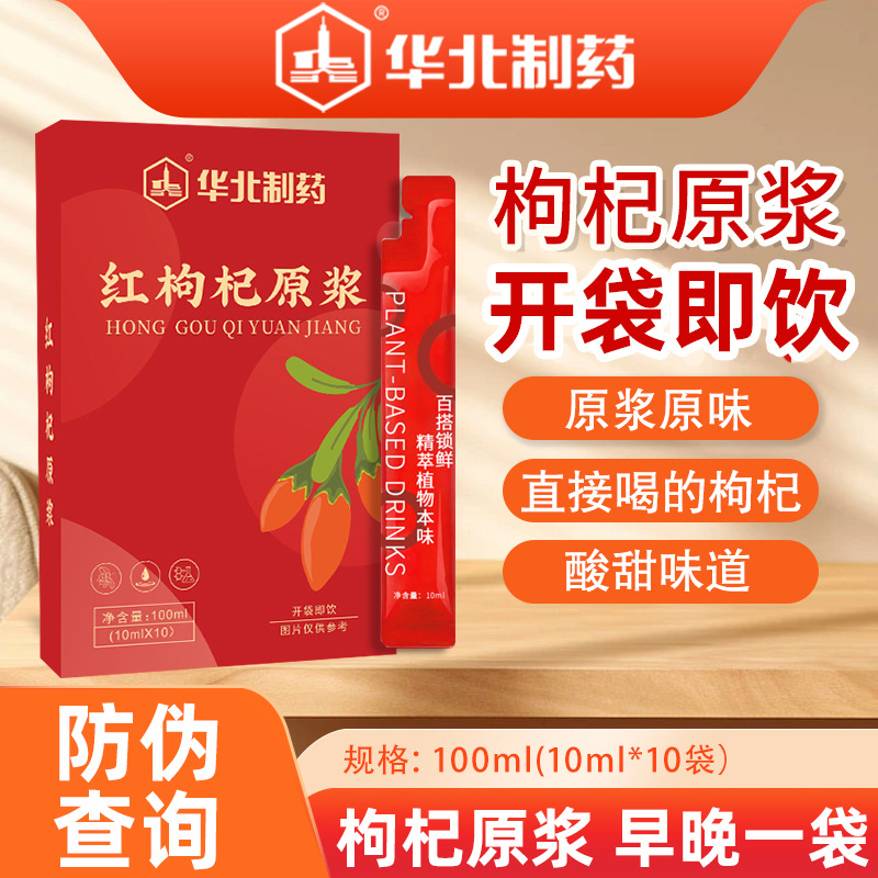 華北製薬紅クコ原パルプ100ml(10ml * 10袋)/箱開袋でクコ植物飲料を飲む
