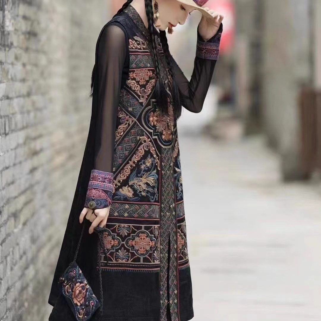 旅游穿搭中长款马甲长外套民族风女装缎面重工刺绣花无袖背心马夹