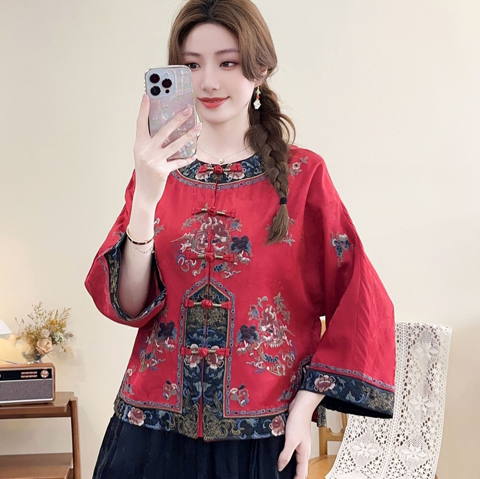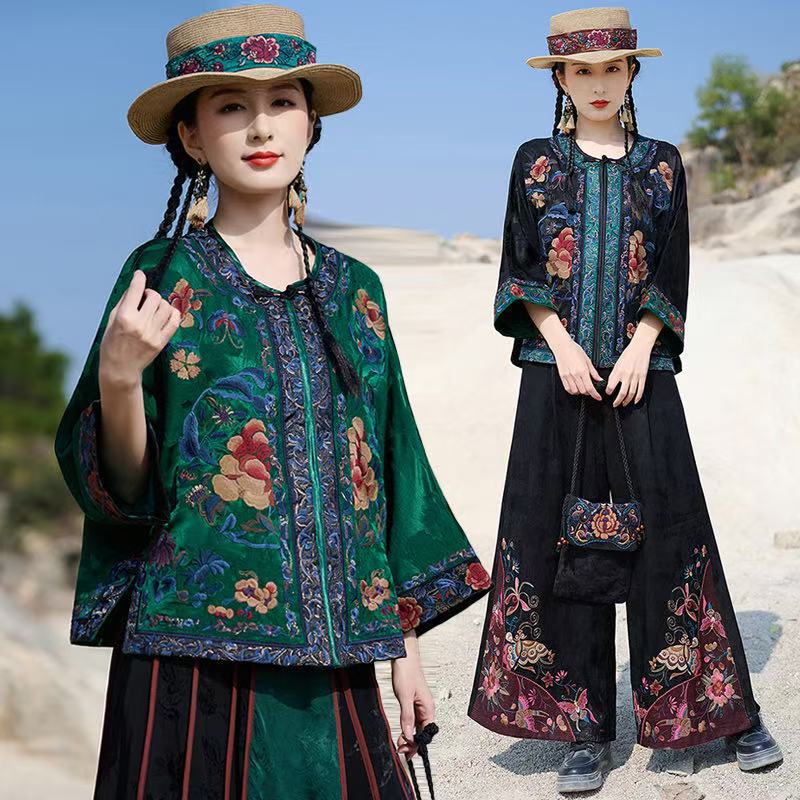 2025新型民族風レトロ刺繍盤ボタン短いコート女性文芸ファッションジャカードサテンゆるい上着