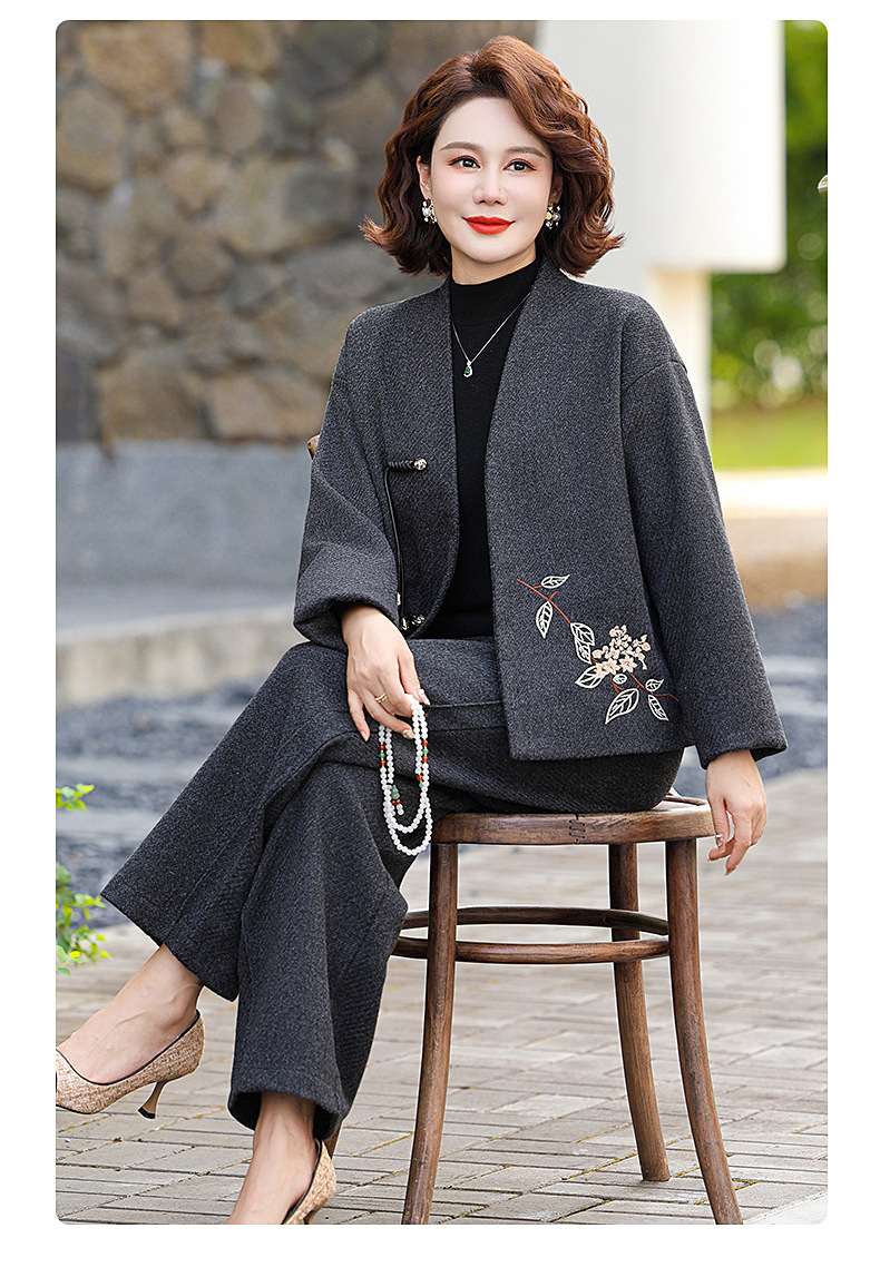 気質のお母さんはコートを着て刺繍します。