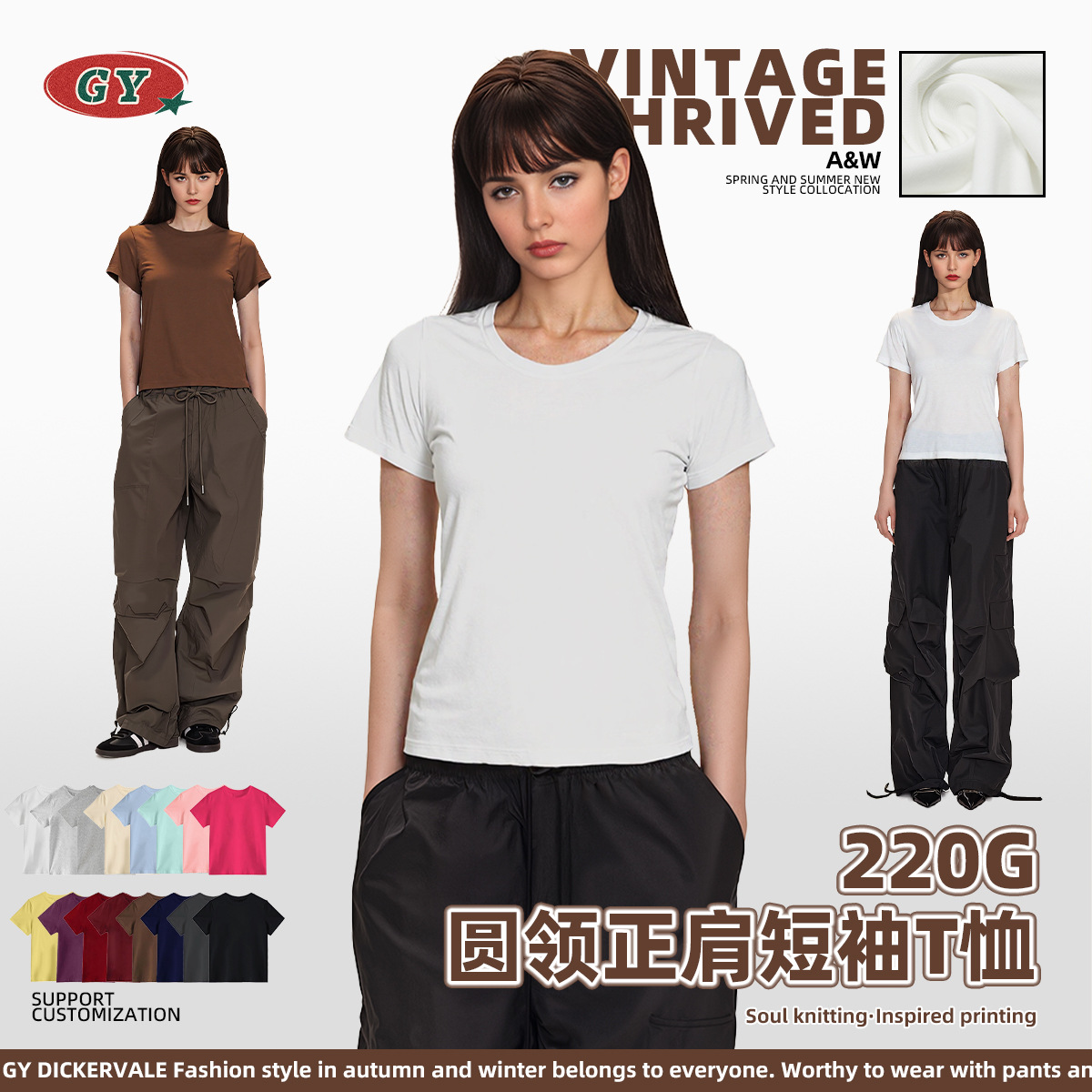 92棉正肩V领短袖T恤女复古辣妹小红书夏季修身显瘦洋气短款T恤