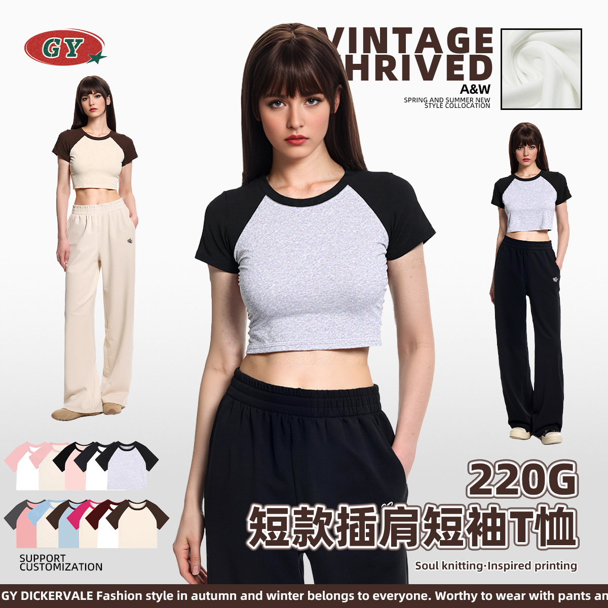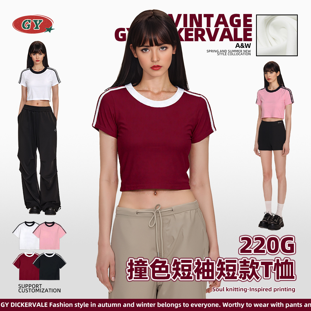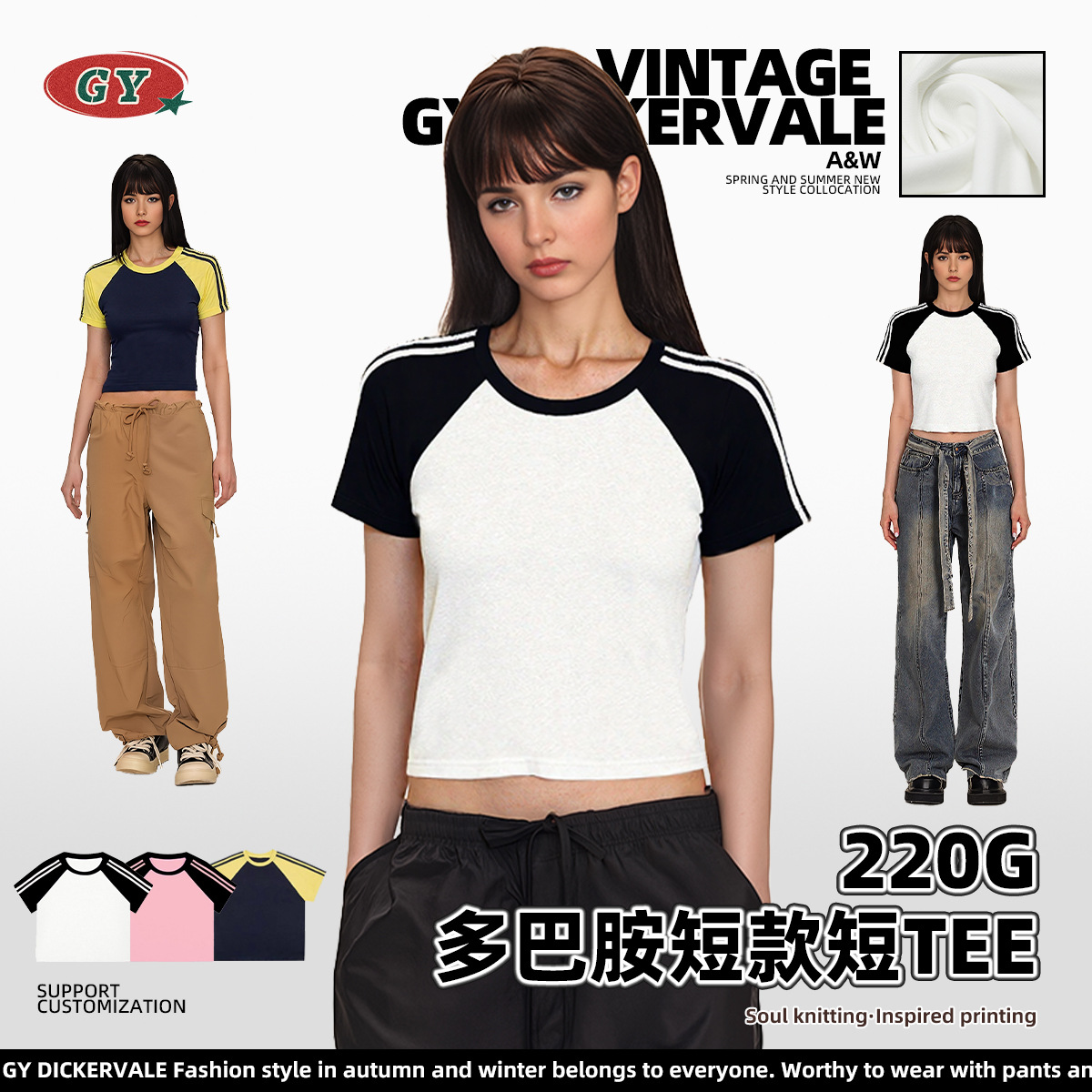 美式2025夏季新款欧美拼色圆领上衣修身显瘦插肩短款短袖T恤女装