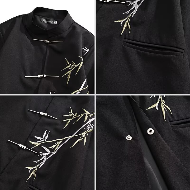 新しい中国式の紳士服の飛行機は中国風の翠竹の刺繍のコートを掛けて肩の卒業式のドレスの男性の中山唐服を掛けます。