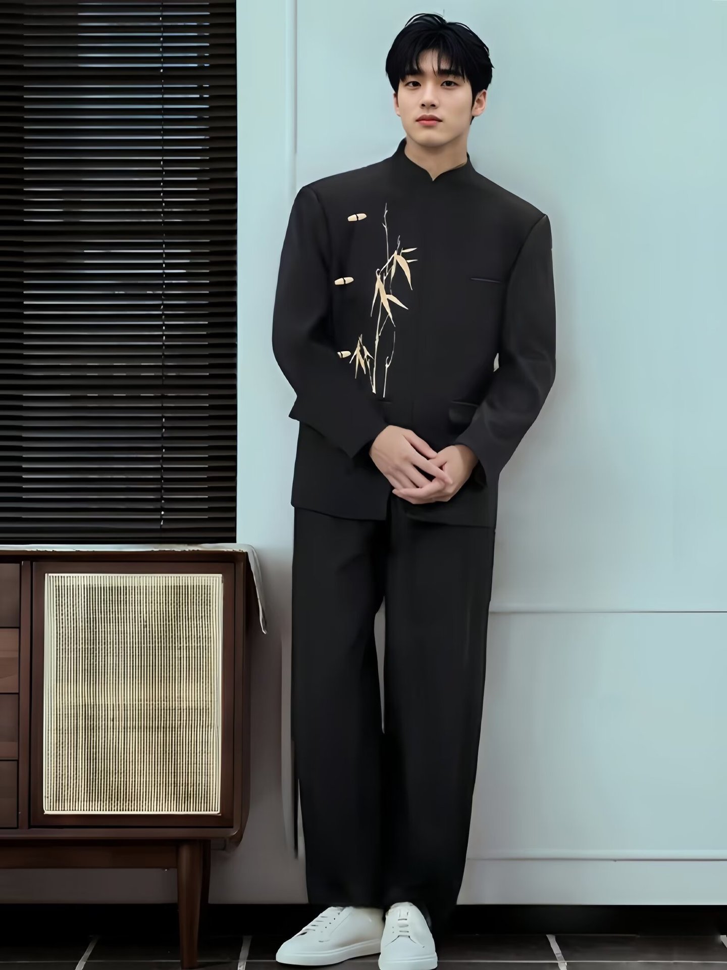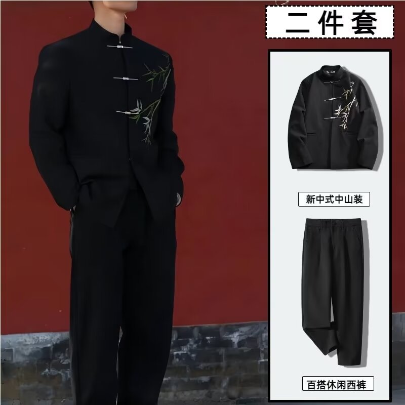 新中国式男性服婚約式カジュアルスーツセット国風立襟金竹刺繍中山服スーツ男