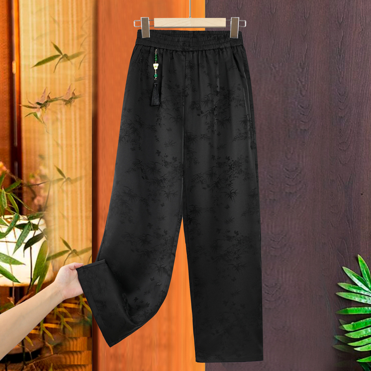 人丝香云纱新中式国风直筒裤洋气吊坠提花阔腿裤春秋显瘦百搭裤子