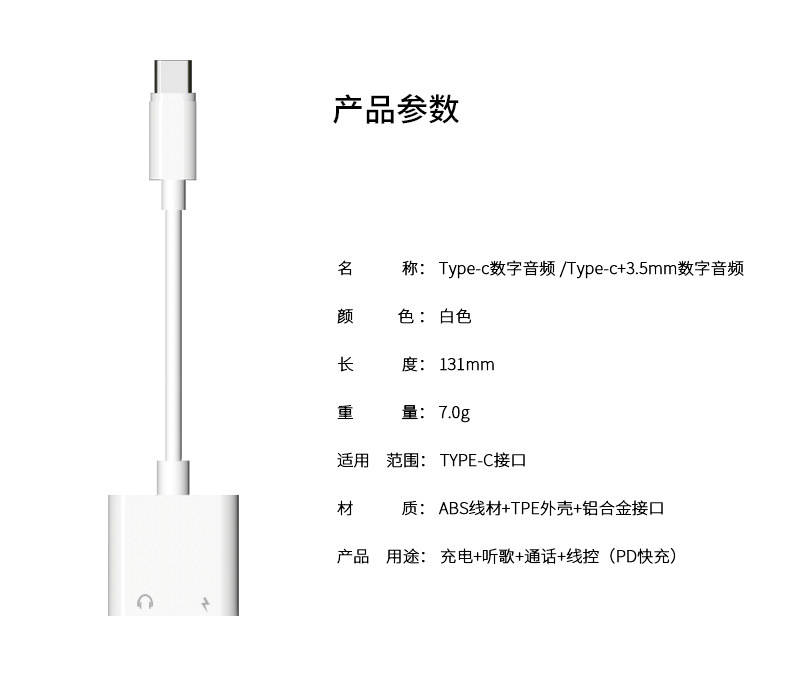 【适用范围】模拟款:不带DAC解码芯片,适用取消3.5mm耳机孔的手机。三星不支持,其它主流品牌手机基本支持,听歌看电视、通话、语音功能。