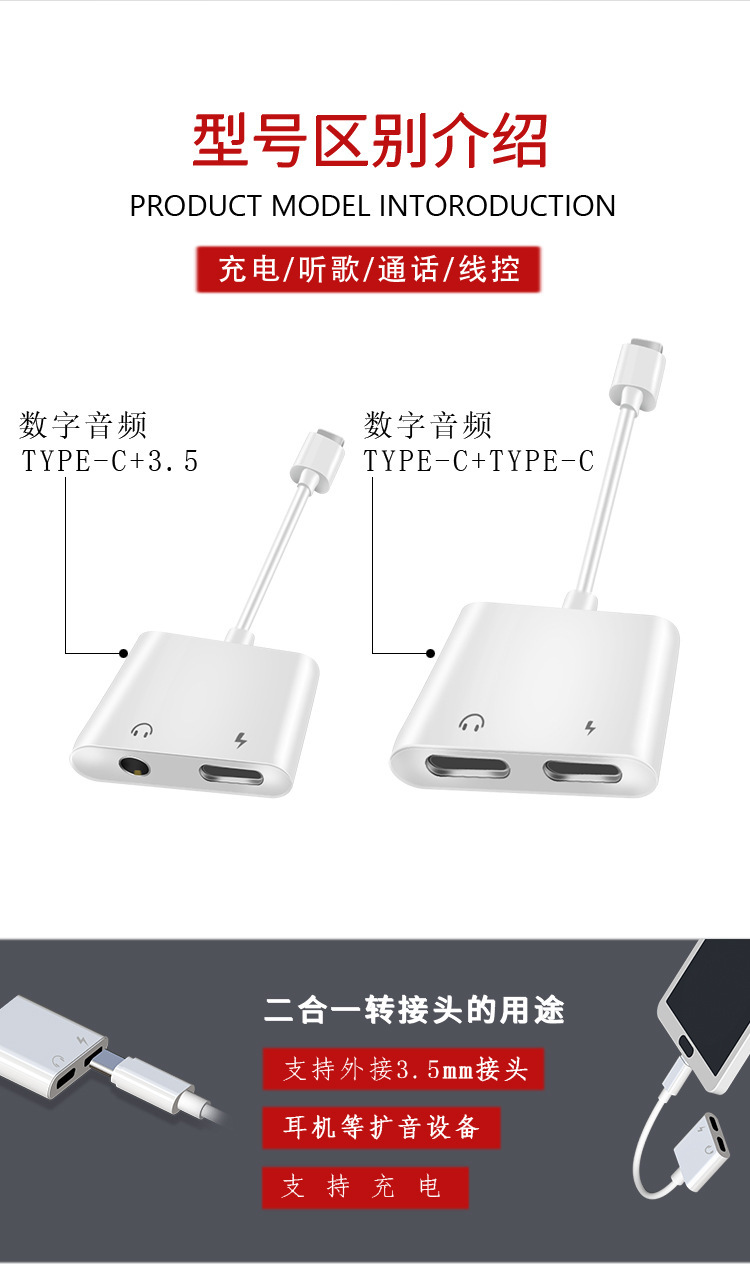 数字信号:带DAC解码芯片,主流品牌基本支持,听歌看电视、通话、语音、U盾(U盾支持大部份银行)、直播、麦克风 。双typec款只支持type-c数字耳机