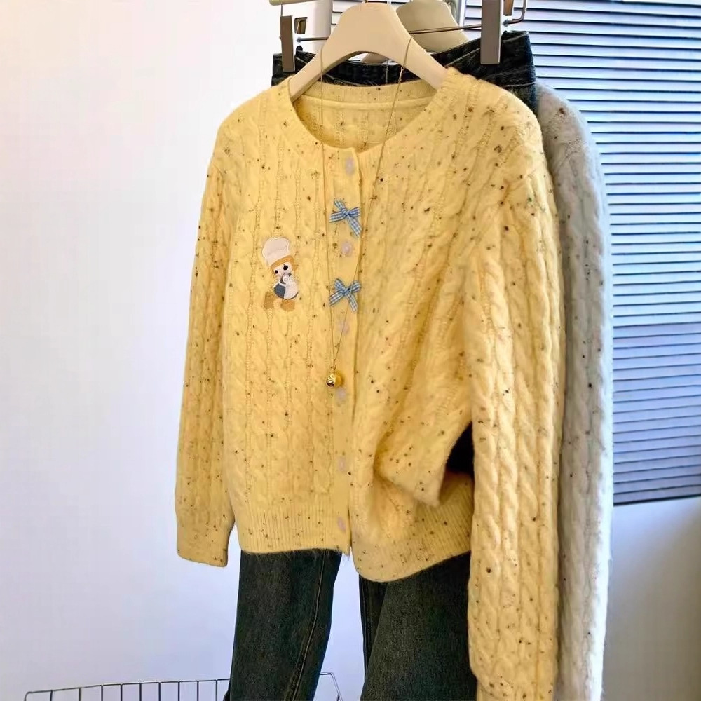 韩系卡通刺绣麻花毛衣开衫女早春季新款奶fufu软糯高级感针织外套
