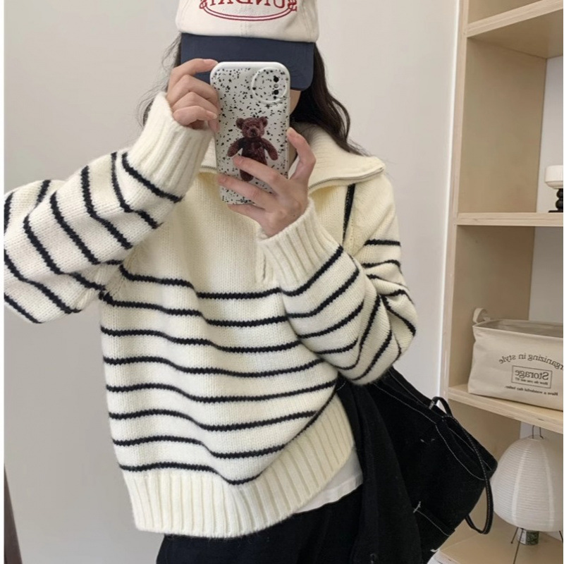 半拉链翻领毛衣女韩系小众条纹宽松外搭秋冬长袖上衣套头针织衫潮