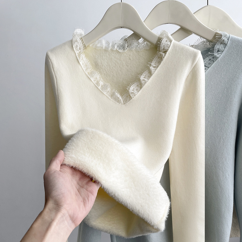 K2002双面磨毛微粒绒拼接花边打底衫女士秋冬季修身百搭长袖上衣