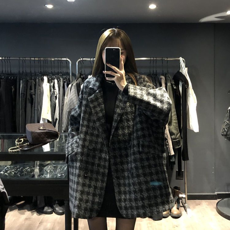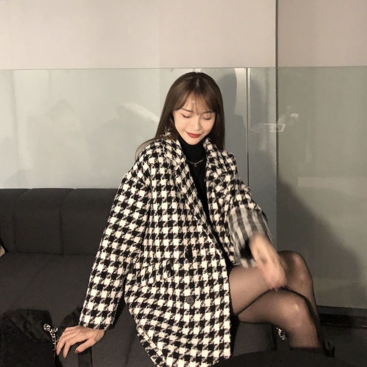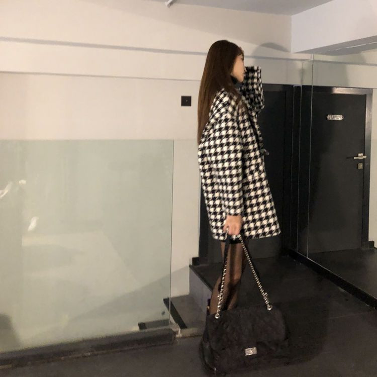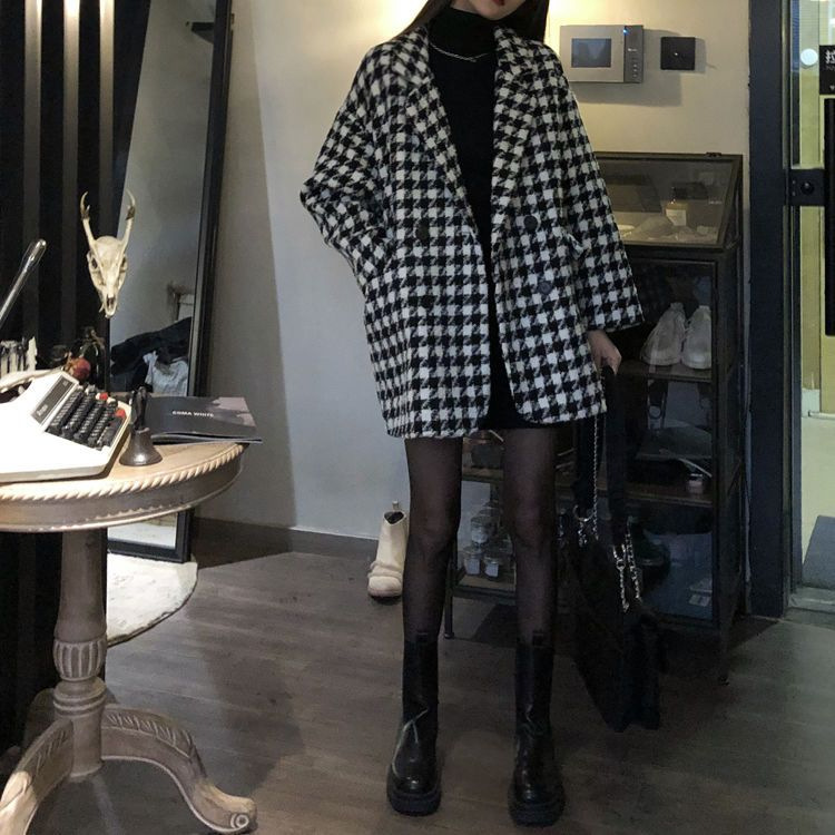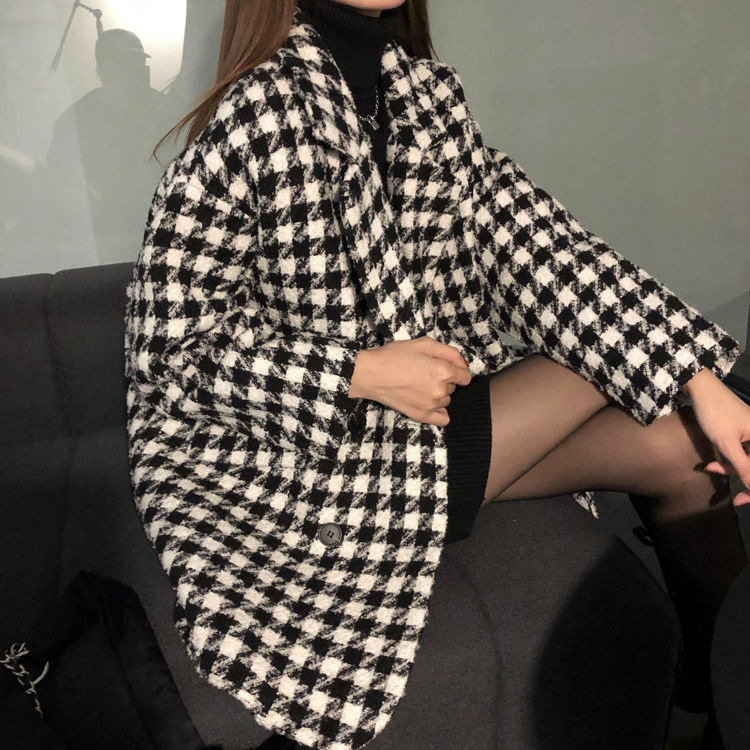 千鳥格子の毛はコートの女性秋冬2024の新型韓国版のゆったりしたカジュアルな厚い中長のコートの女性です。