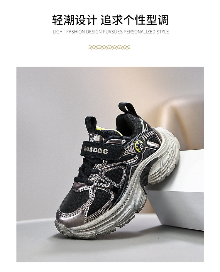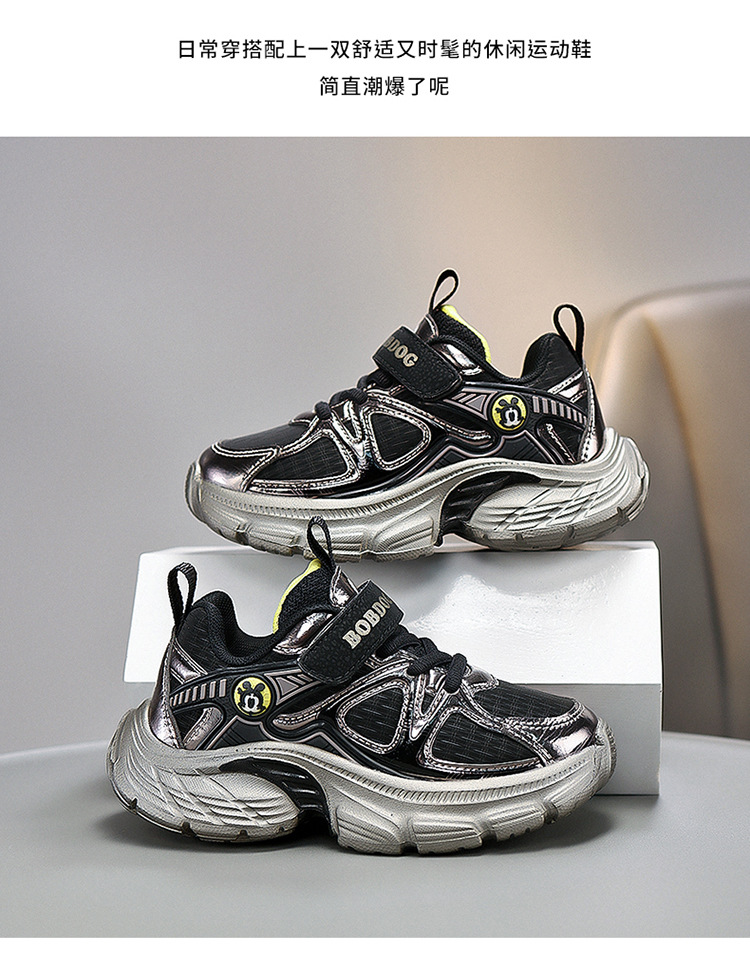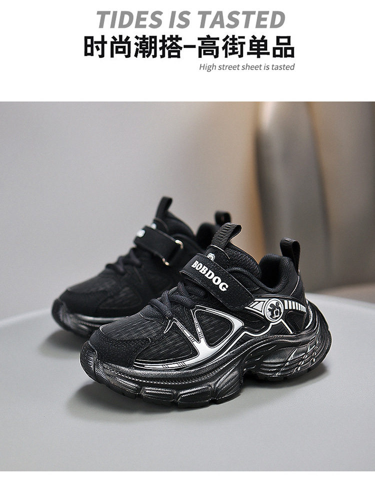 巴布豆童鞋男童黑色运动鞋2025秋季款皮面防水儿童鞋子男孩老爹鞋