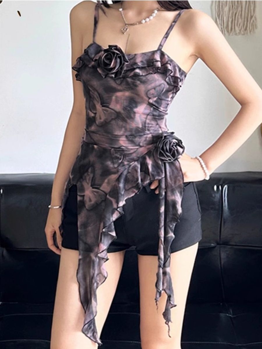 アメリカのレトロなぼかしの立体のバラのガーターのベストの女性の秋の新型のギャルのセクシーな不規則な百合の上着