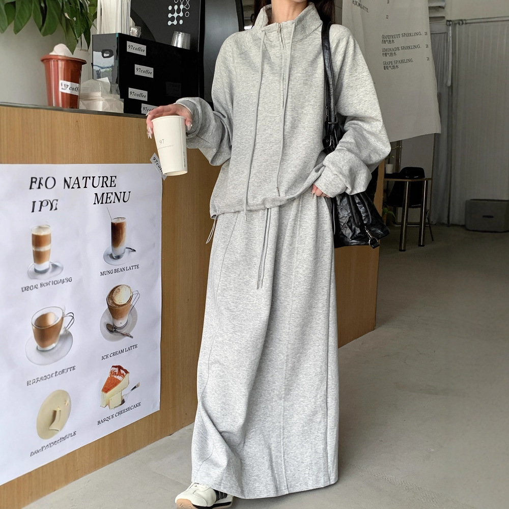 慵懒风休闲套装杏色立领长袖卫衣女初秋季抽绳半身裙A字裙两件套