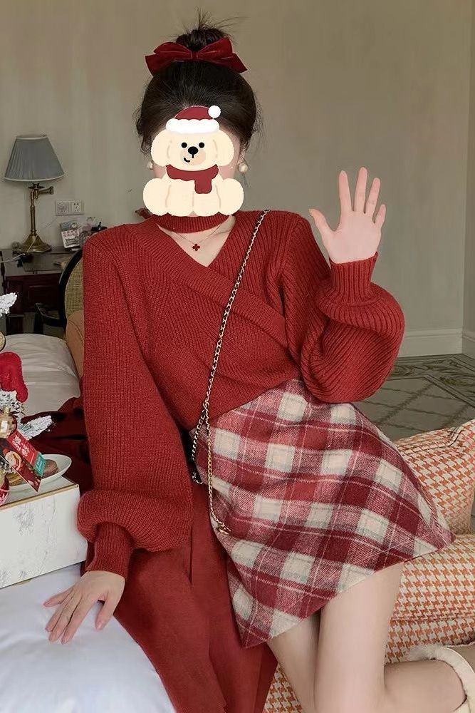 冬装搭配一整套装女小香风红色毛衣针织衫毛呢格子半身短裙两件套
