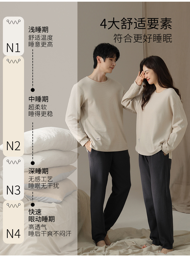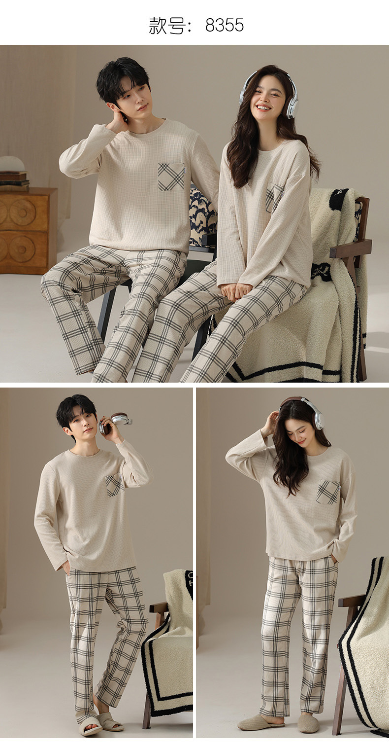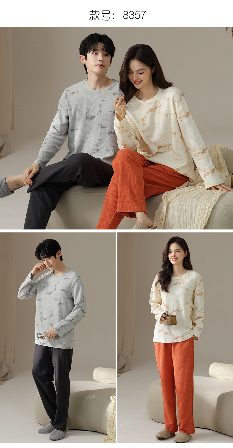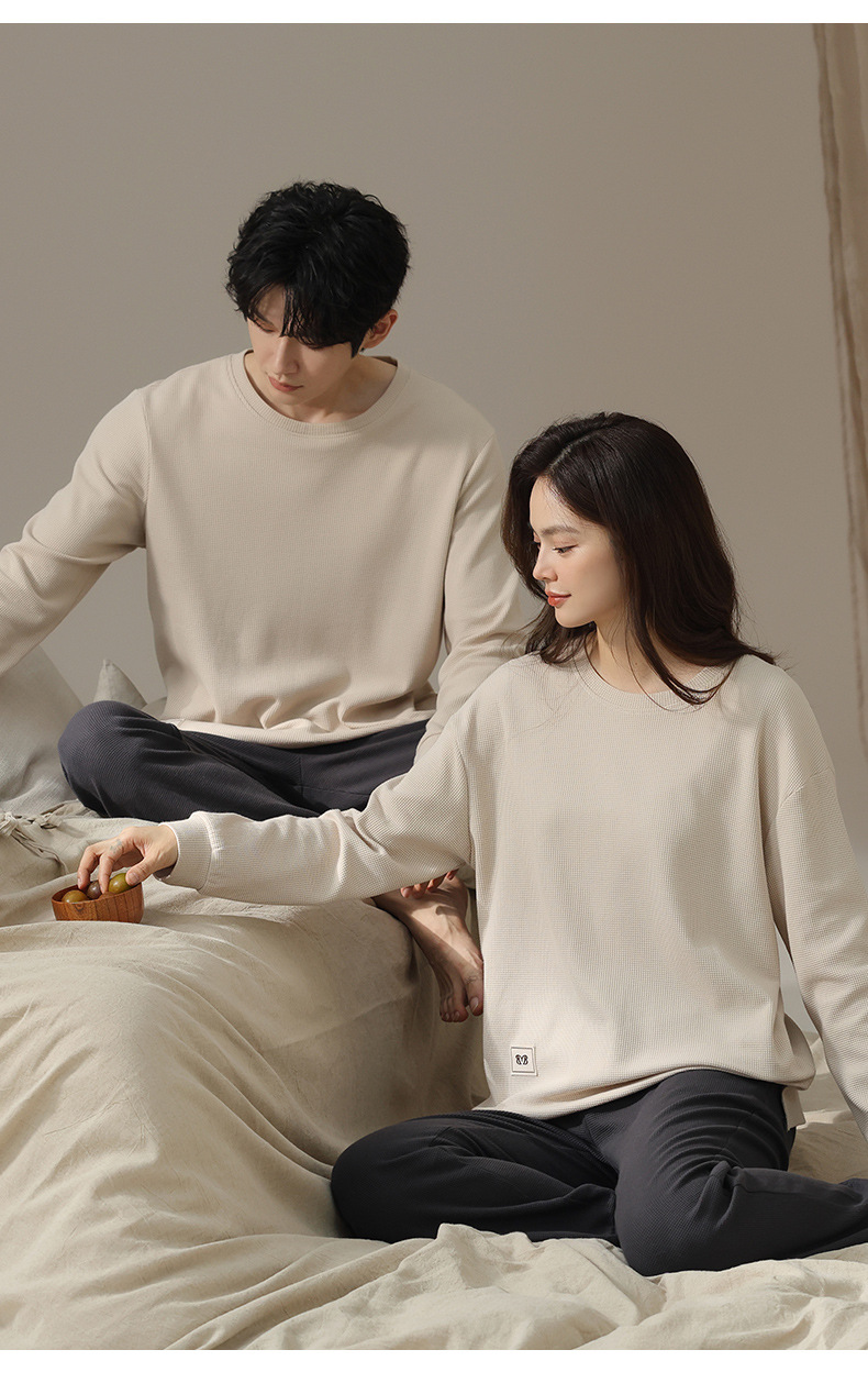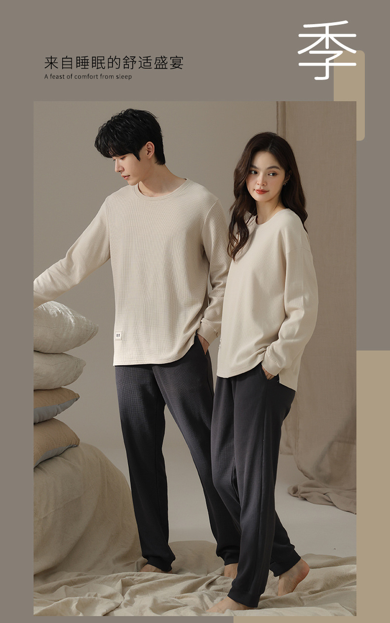 カップルのパジャマ春秋の純綿長袖のワッフルの新しい丸首の頭の綿の家の服は外にスーツを着ることができます。