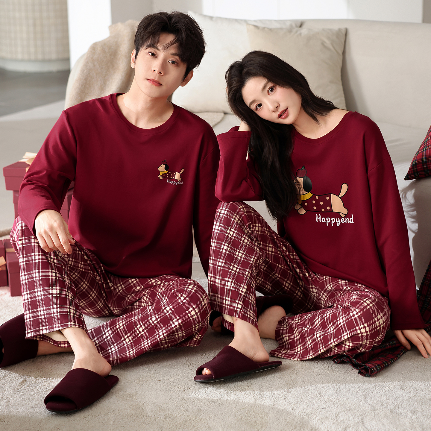 男性パジャマ結婚新婚カップルセット綿の赤い綿100% の家庭服女性春秋冬長袖セット