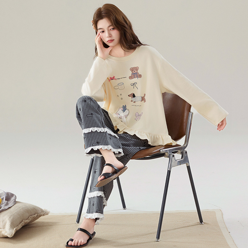A类抗菌95棉爽棉睡衣女春秋季长袖女士卡通少女蕾丝边纯棉家居服